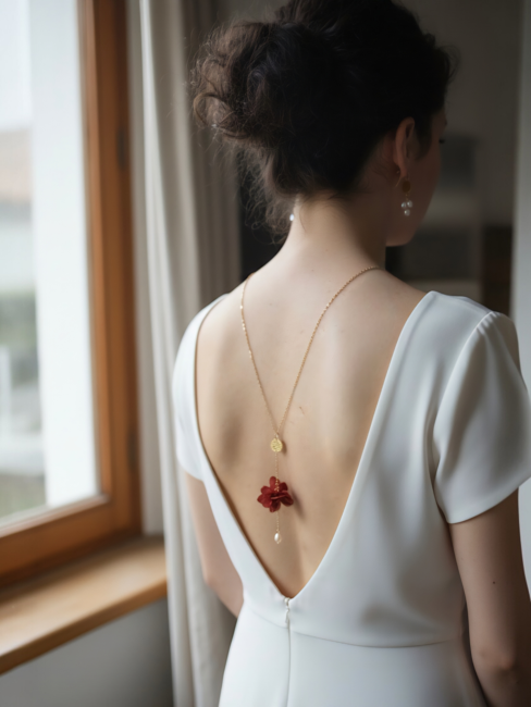 Collier de dos fleuri amovible – Chaîne perlée nacrée et fleur tons rouges et roses | Bijou de mariée l’Atelier du 6.