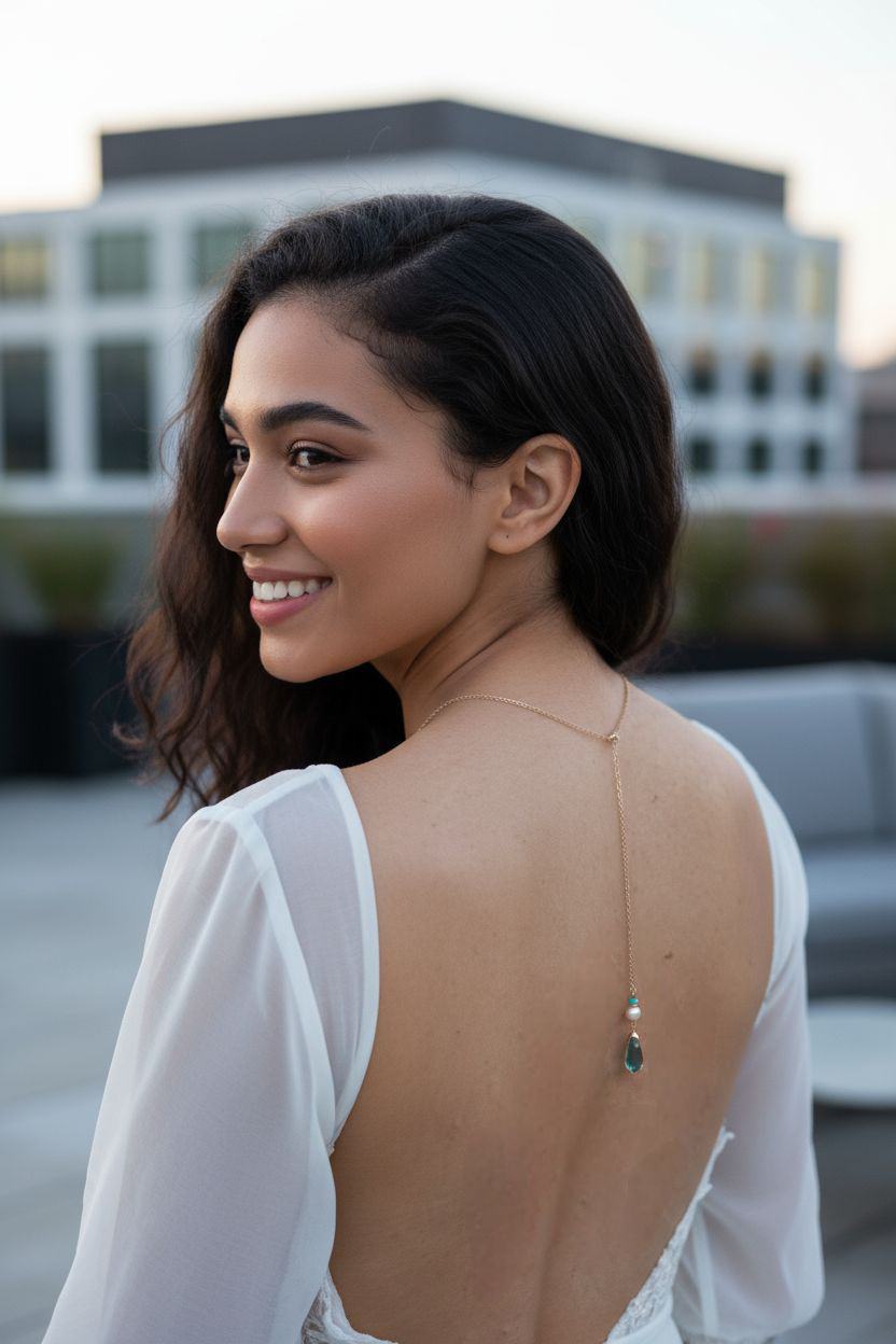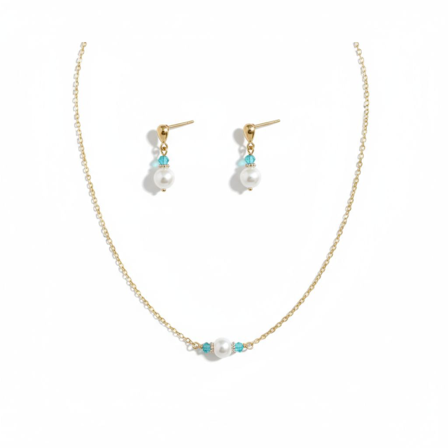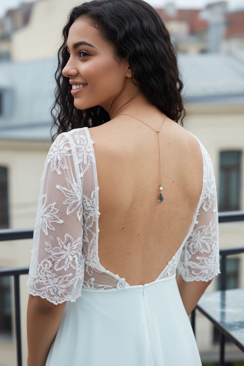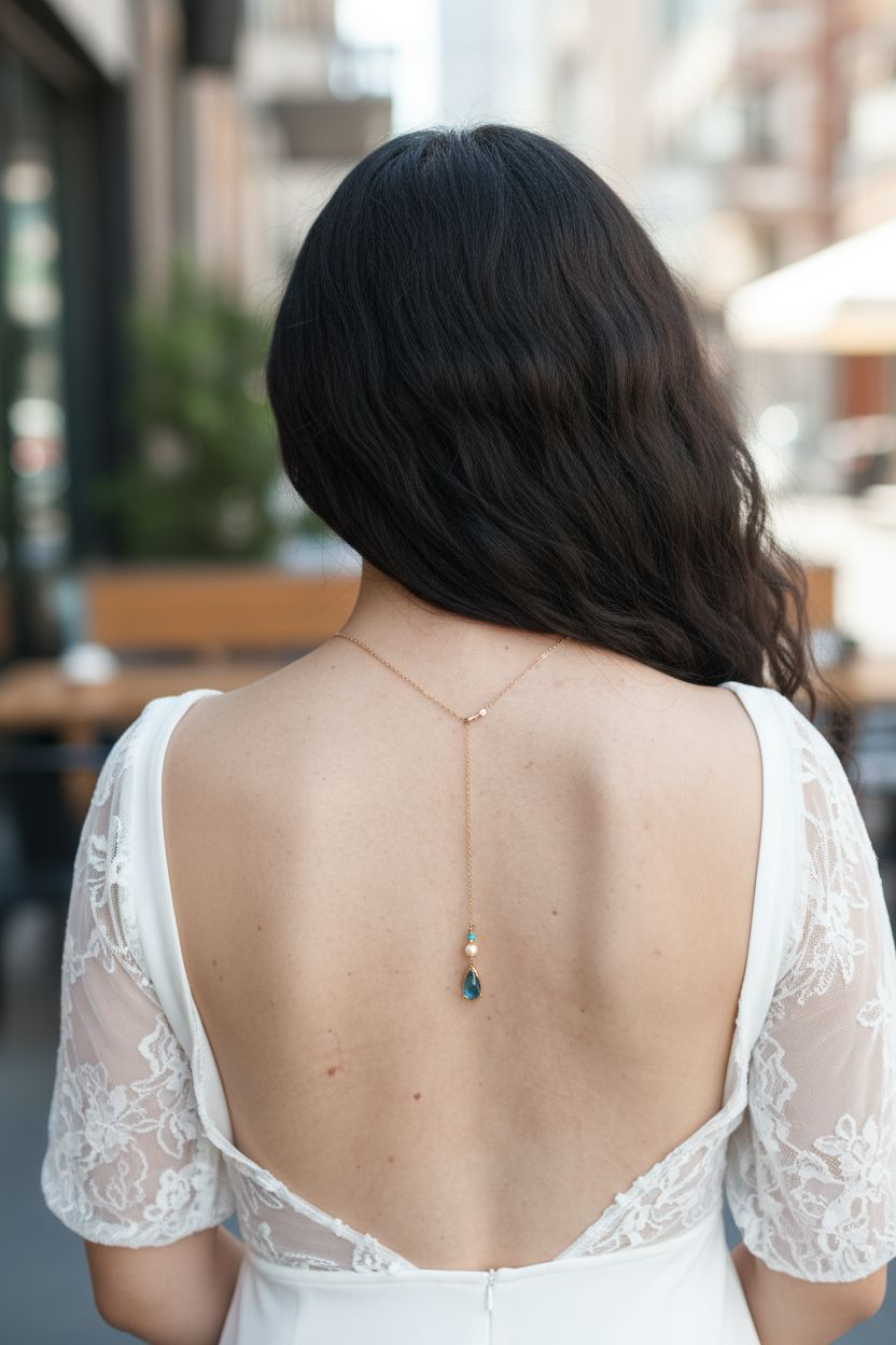 Collier de dos en acier doré composé de perles nacrées blanches et toupies bleues Swarovski. Bijou de dos pour tenue avec dos ouvert, serti bleu et rappel des perles de l'avant au dos. Dimensions collier avant, petit fermoir mousqueton, non ajustable : 45 cm. Chaîne de dos : 12 cm. Perles : 8 et 4 mm. Nacrées blanches et cristal AB bleu.