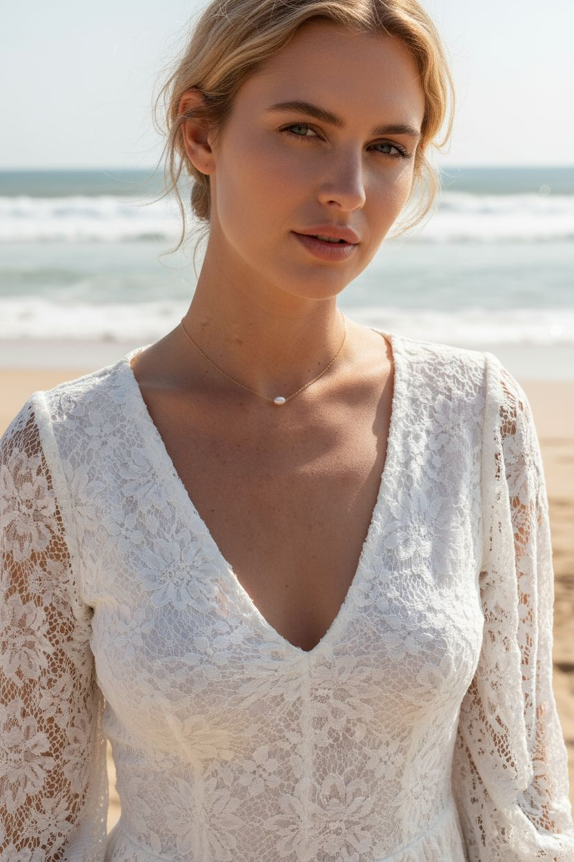 Ce collier de mariée se porte avec un décolleté montant travaillé, mais également comme un petit bijou de tous les jours avec une tenue décontractée.