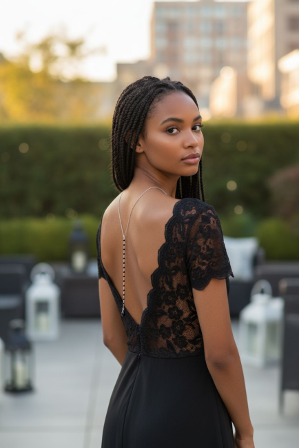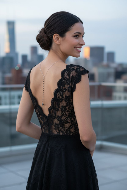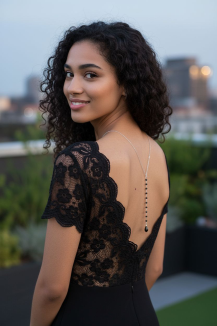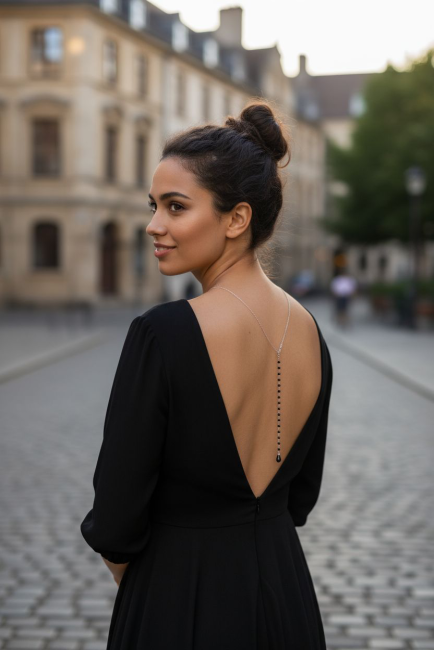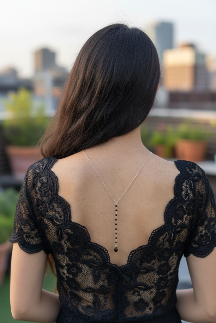 Ce collier de dos délicat a été conçu pour compléter une robe de soirée où une combinaison dos nu, ce bijou élégant et raffiné apportera une touche sexy à votre tenue. Osez le noir pour son élégance !
