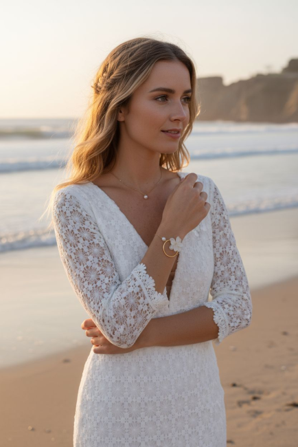 Ce bracelet au charme raffiné et délicat est conçu d'un anneau avec fleurs d'Hortensias stabilisées blanc et orné d'une perle de culture blanc naturel.