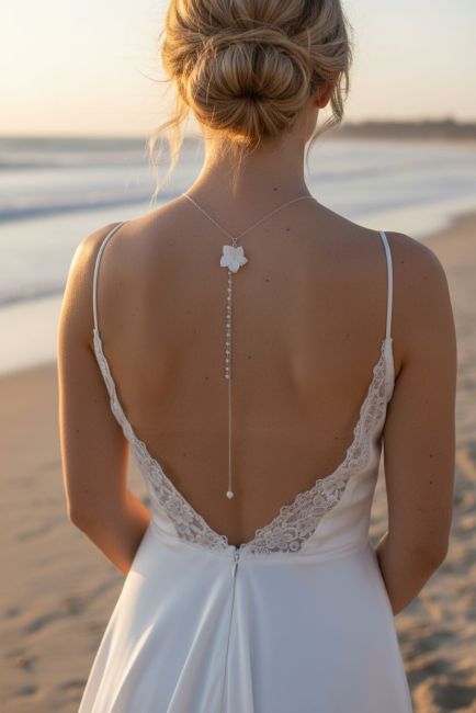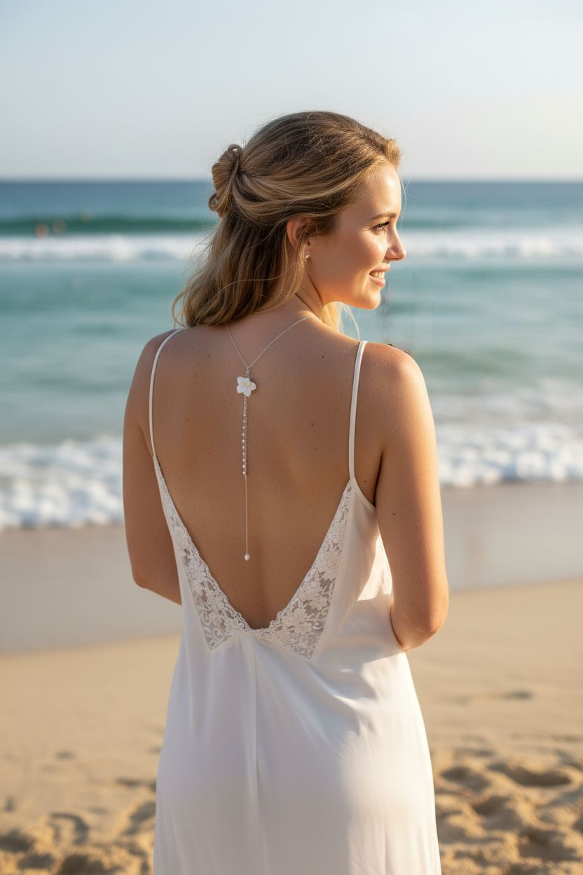 Bijou de mariage à dos nu avec fleur de Frangipanier- collier de mariage pour robe dos nu-collier à fleur blanche et chaîne finition argentée ou dorée. Esprit bohème et chic.