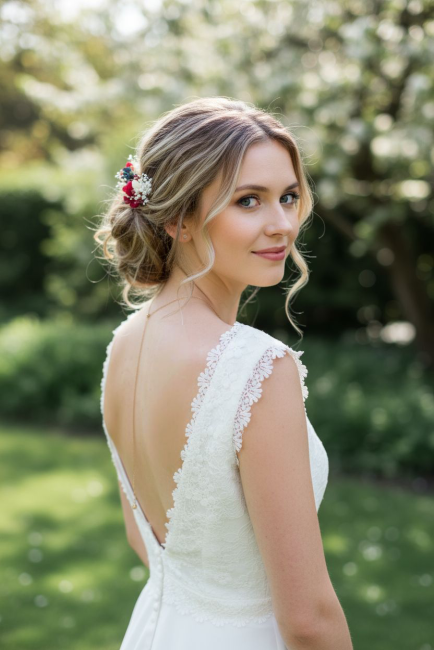Chaque épingle est soigneusement ornée de fleurs minutieusement sélectionnées, offrant une composition aérienne et harmonieuse. Légères et faciles à fixer, elles s’adaptent à tous les styles de coiffures, des chignons flous bohèmes aux attaches plus sophistiquées.