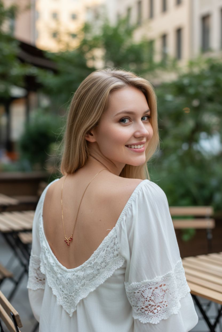 Ce collier de dos s’enfile simplement par la tête et se déploie avec grâce dans le dos, apportant une finition sophistiquée à une robe au décolleté plongeant. Sa chaîne argentée est ornée de perles d’un bleu profond, évoquant l’intensité des océans et la pureté du ciel nocturne. En son centre, une pierre sertie aux nuances bleutées capte la lumière et attire le regard.