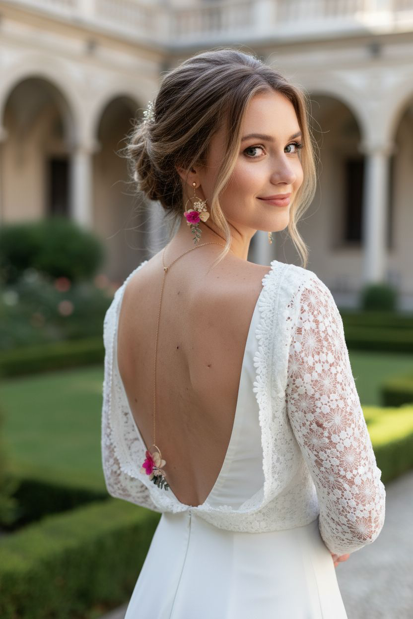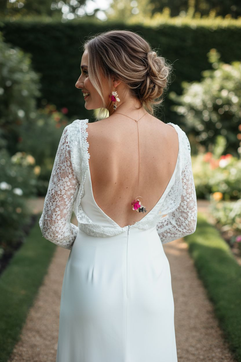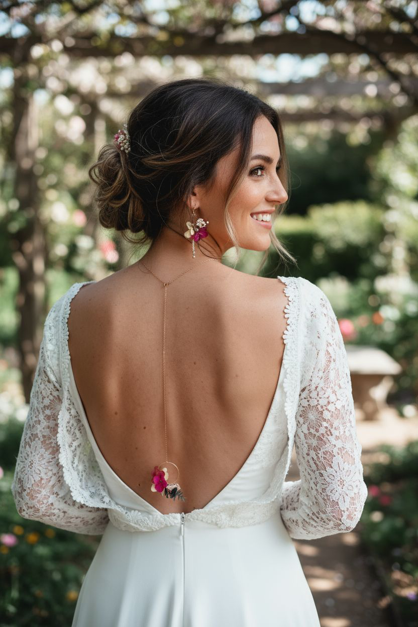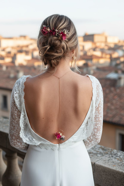 Complétez votre robe de mariée avec ce collier de dos amovible, un bijou raffiné alliant délicatesse et poésie florale. Son anneau fleuri, composé de fleurs stabilisées aux teintes douces et vibrantes – jaune pâle, fuchsia et garnet – est harmonieusement accompagné de feuilles d’eucalyptus et d’un feuillage blanc aérien.