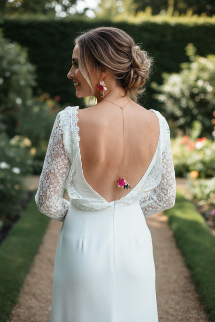 Conçu pour sublimer une robe de mariée au dos dégagé, ce collier est à la fois élégant et pratique grâce à son système amovible, permettant de l’adapter à votre tenue avec aisance et de porter le collier seul une fois votre mariage passé.
