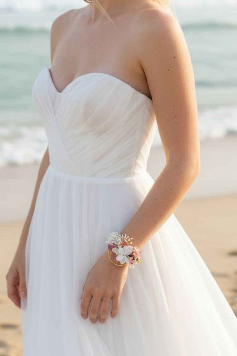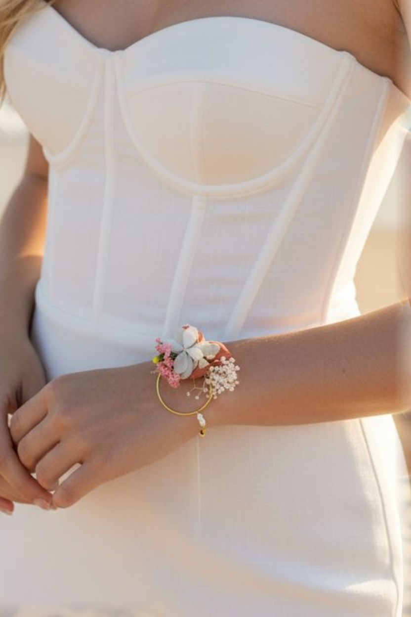 De subtils détails végétaux et floraux rose pâle et jaune viennent enrichir cette composition tout en légèreté, apportant une touche fraîche et naturelle à votre poignet.
