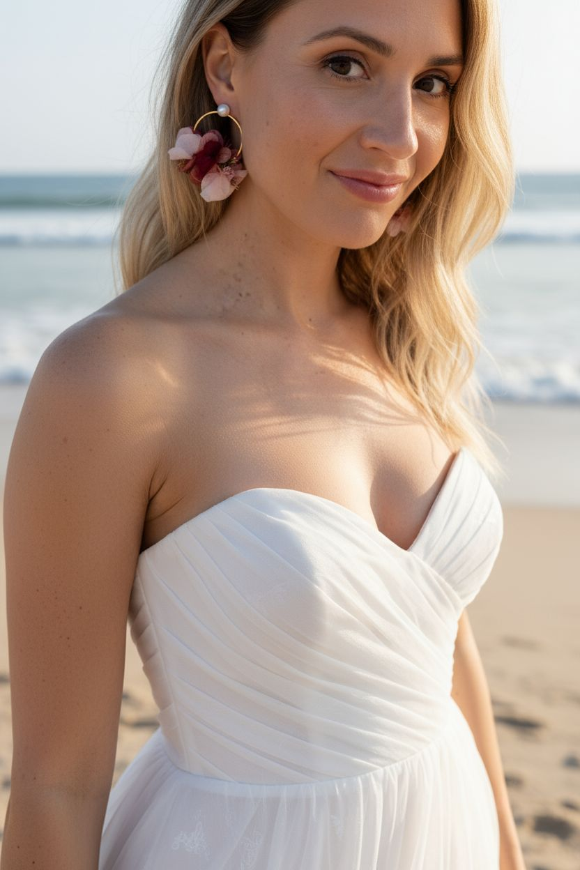 Ces délicates créoles dorées célèbrent la poésie florale avec une composition raffinée de véritables fleurs d’hortensia stabilisées, déclinées en nuances de vieux rose, rose pâle et bordeaux. De fins détails végétaux rose viennent sublimer l’ensemble, apportant douceur et romantisme.