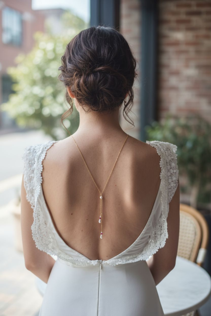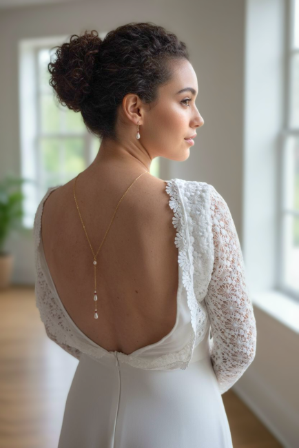 Ce bijou met en valeur les robes dos nu et s’accorde aussi bien avec un style classique qu’avec une allure contemporaine. Léger et confortable, il accompagnera la mariée tout au long de la journée sans contrainte.