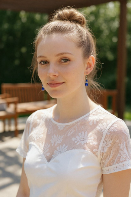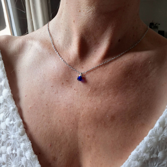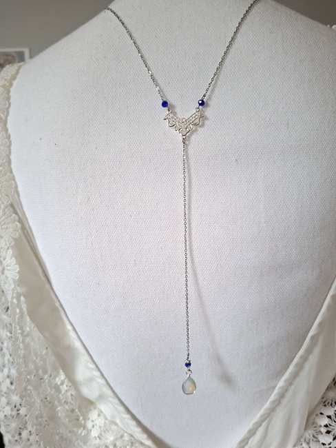 Réalisé à la main dans mon atelier, ce bijou associe l’éclat de perles bleues royales à la douceur d’une petite goutte bleue pâle qui vient se poser délicatement dans le bas du dos.