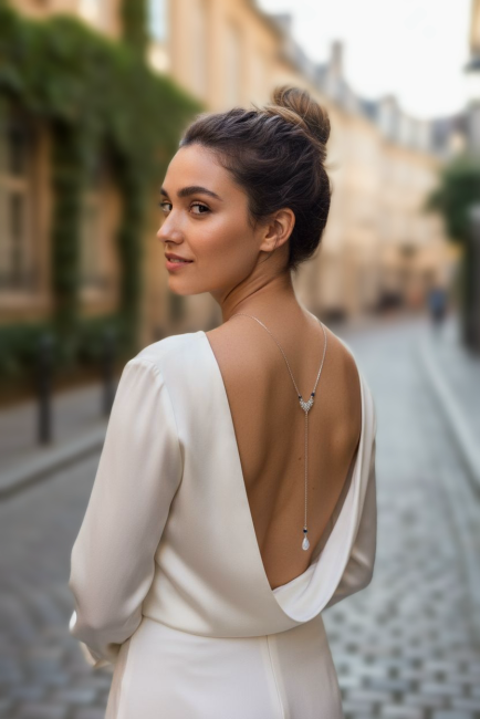 Ce collier de mariée argenté est une création délicate et poétique, pensée pour les mariées au style bohème et raffiné.