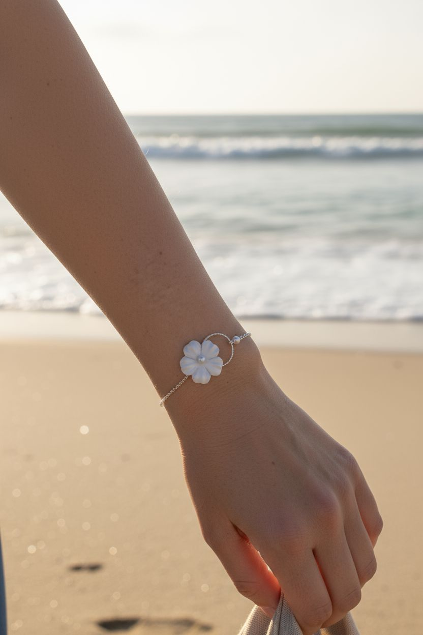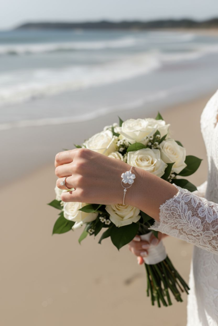 Monté sur une chaîne fine et ajustable, ce bracelet s’adapte parfaitement à tous les poignets et apporte une touche de douceur naturelle à votre tenue de mariage.