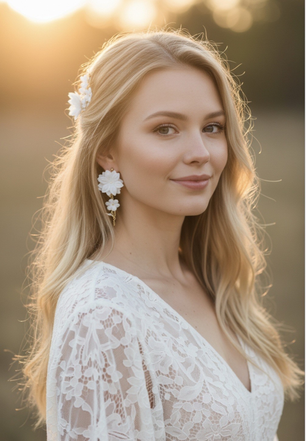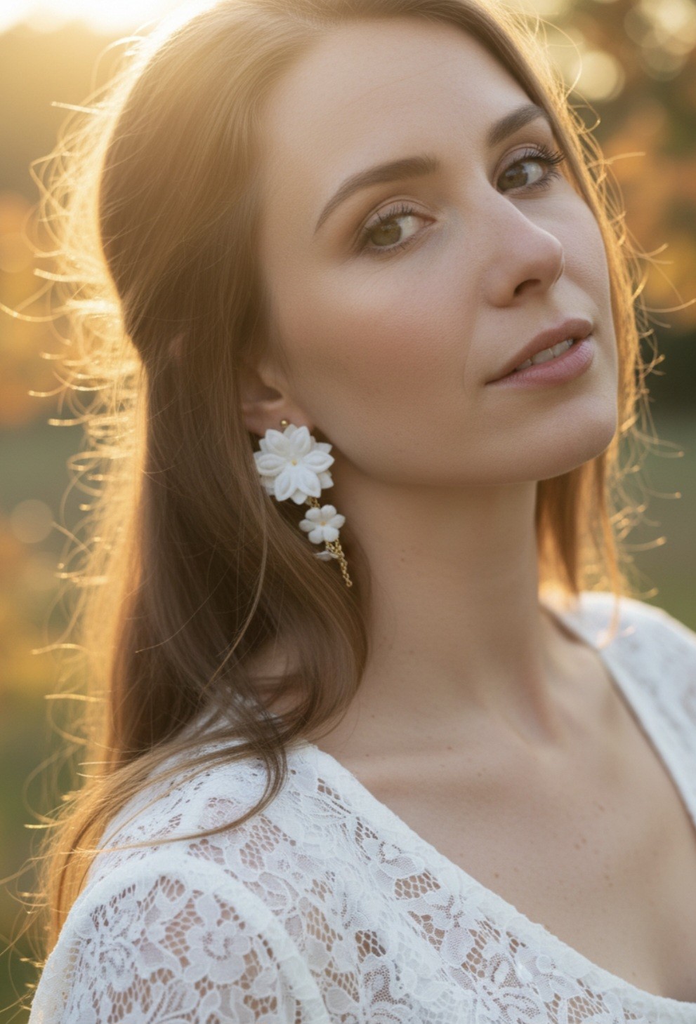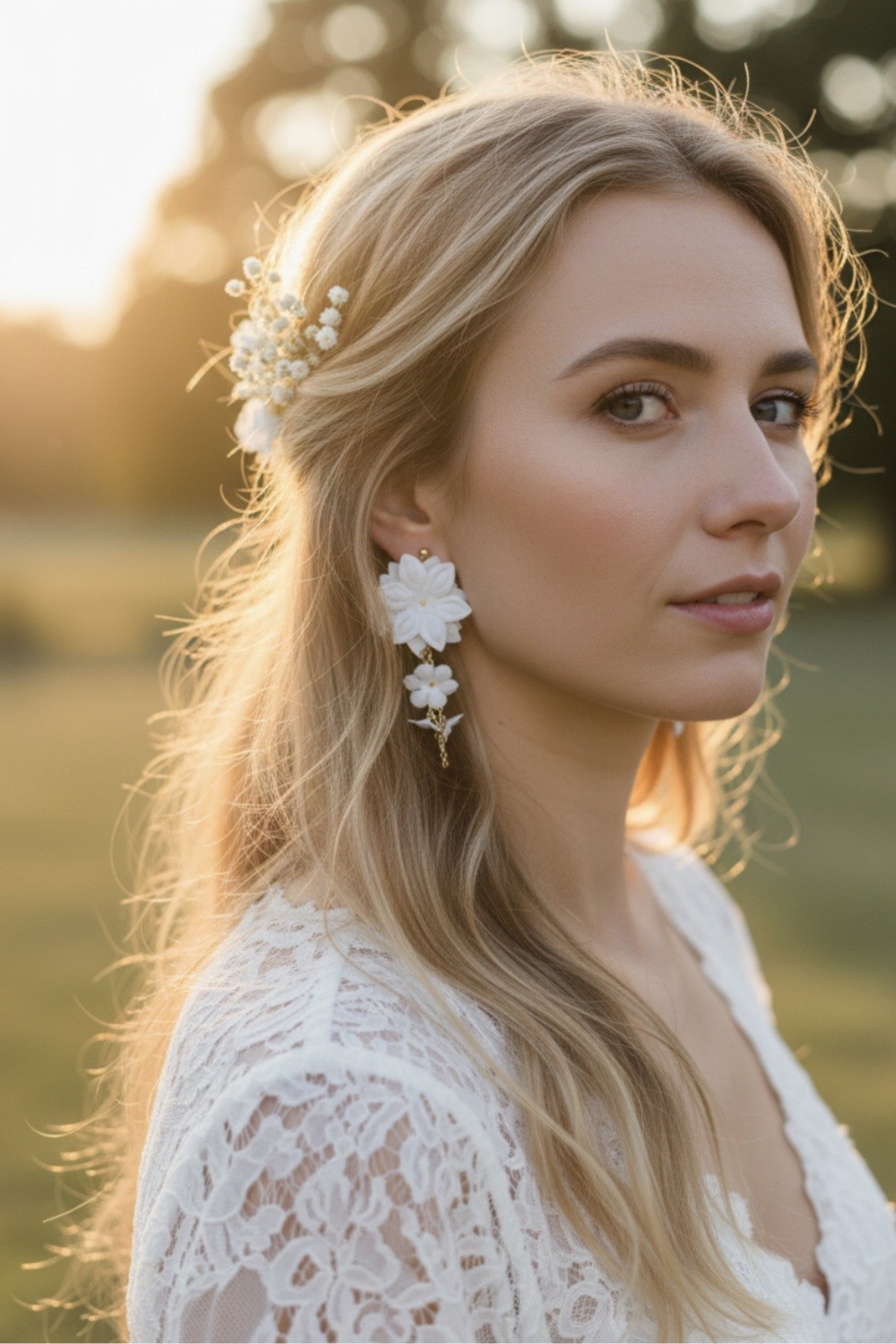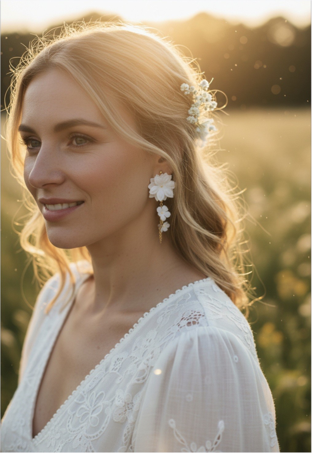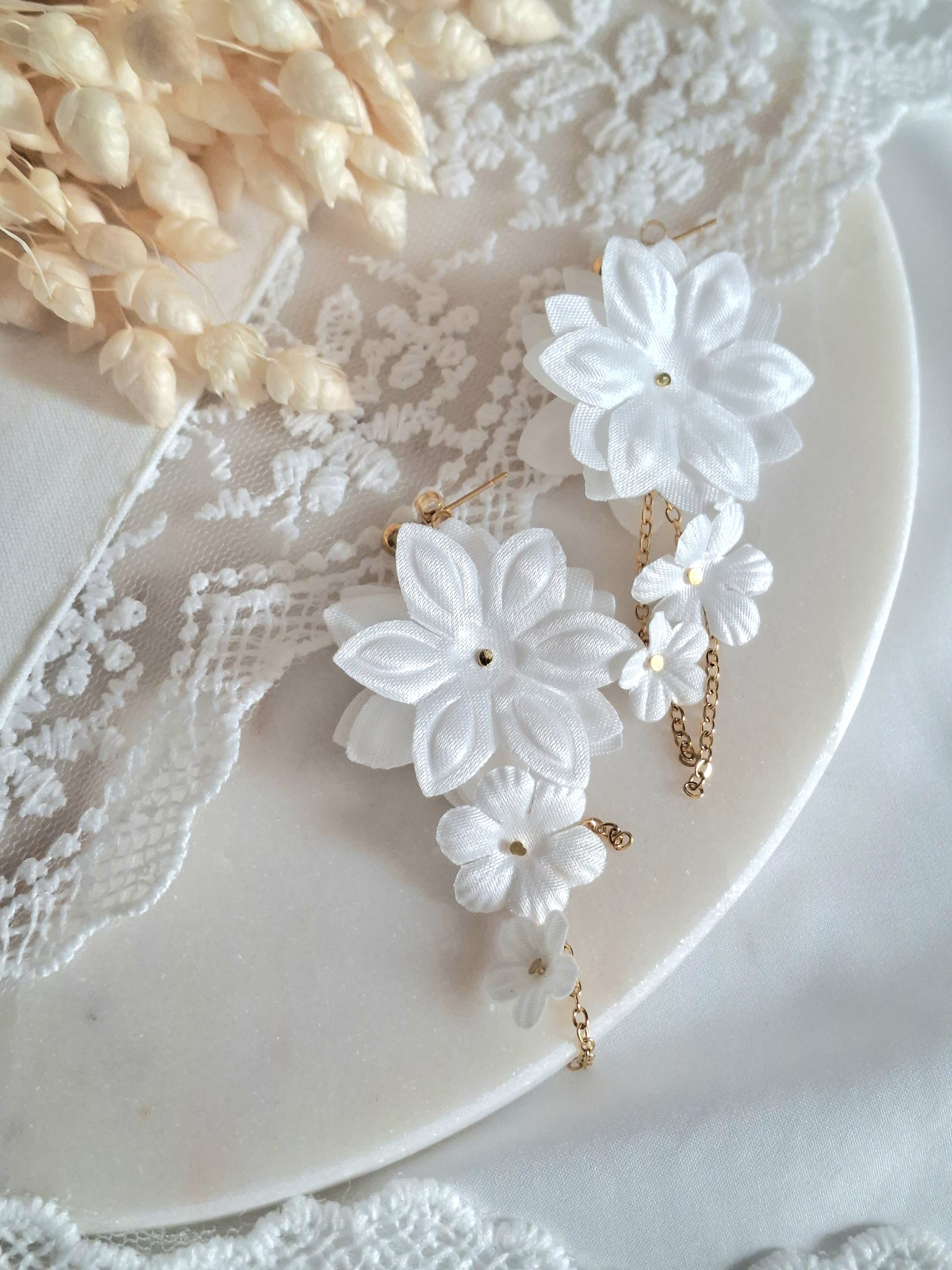 Légères, délicates et naturellement romantiques, ces pendantes de mariée sont réalisées avec une multitude de petites fleurs blanches en tissu, soigneusement assemblées pour créer un mouvement doux et aérien. Leur design épuré apporte une fraîcheur moderne tout en conservant l’esprit poétique cher aux mariages intemporels.