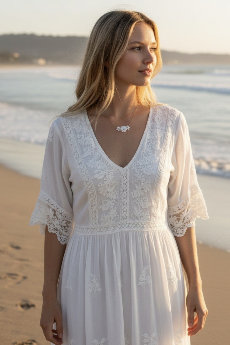 Complétez votre tenue avec nos accessoires assortis ; collier de dos, bracelet et pic à chignon en vente sur notre boutique.