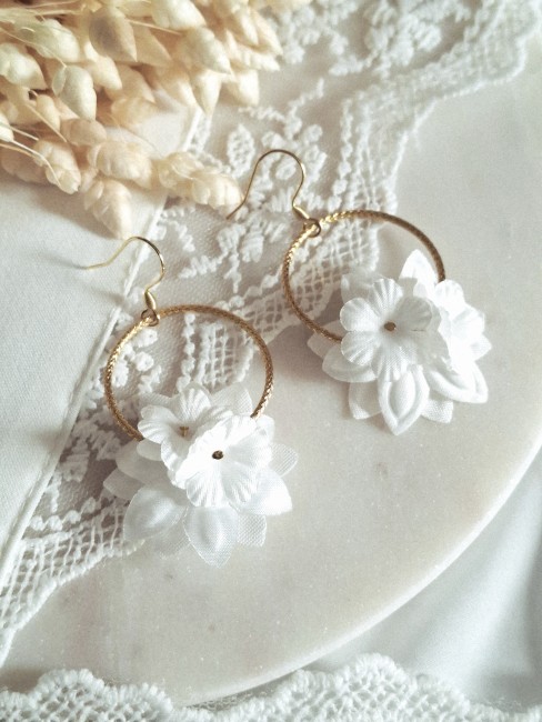 Ces créoles martelées apportent une touche de poésie et de lumière à votre tenue de mariée. Réalisées entièrement à la main dans mon atelier, elles sont ornées de délicates fleurs en tissu blanc, sélectionnées pour leur finesse et leur douceur visuelle. Chaque fleur possède une forme ou un diamètre légèrement différent, créant un joli jeu de volumes, très naturel et féminin.