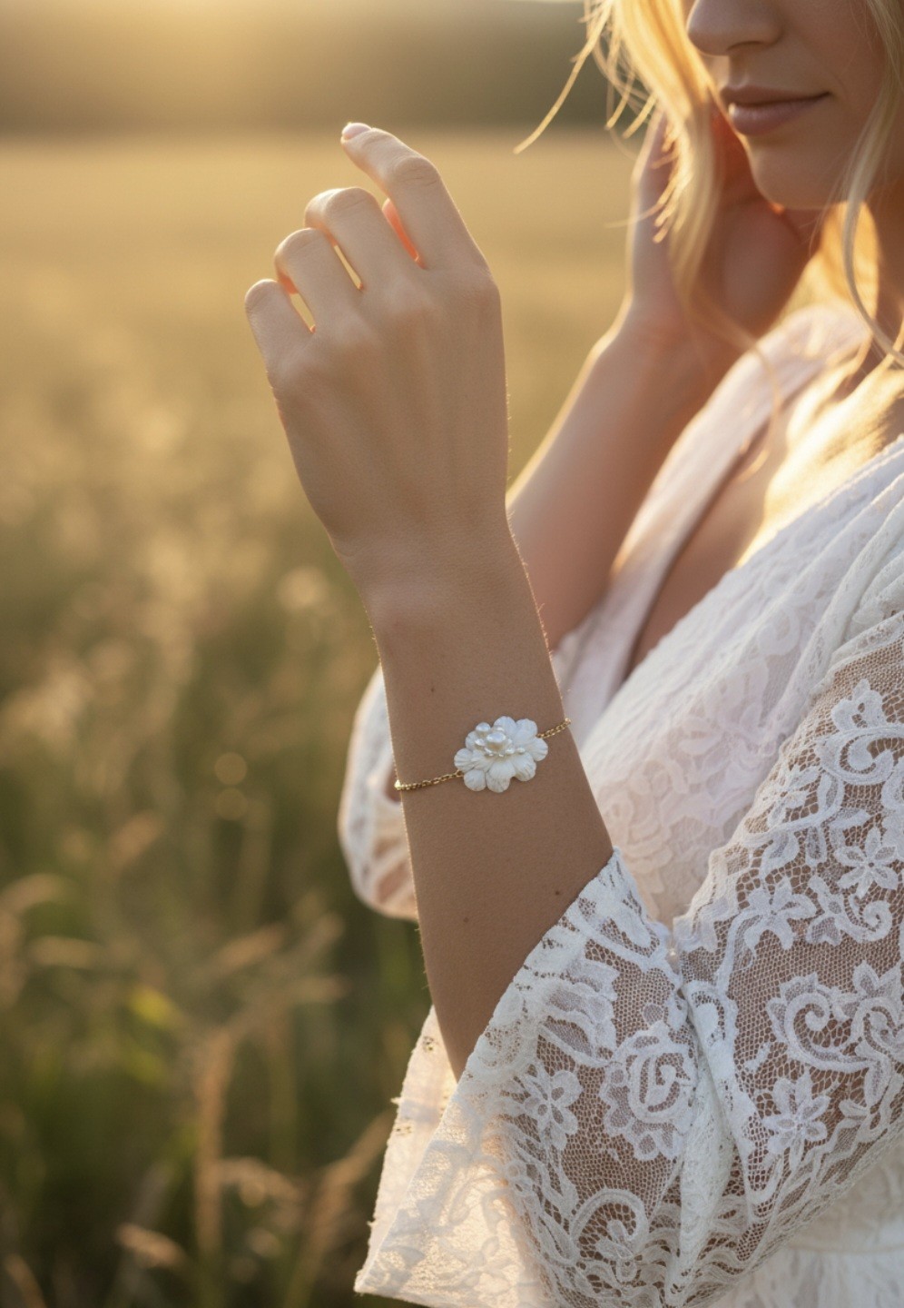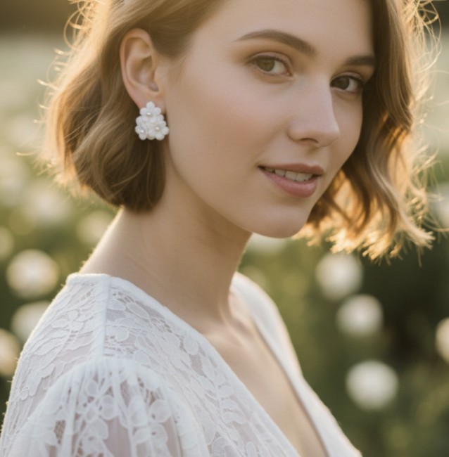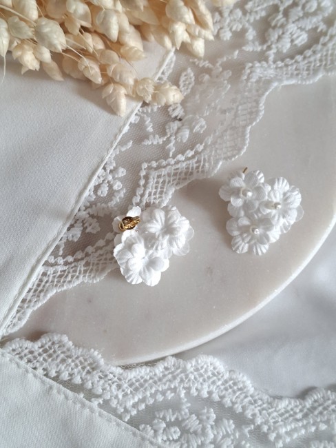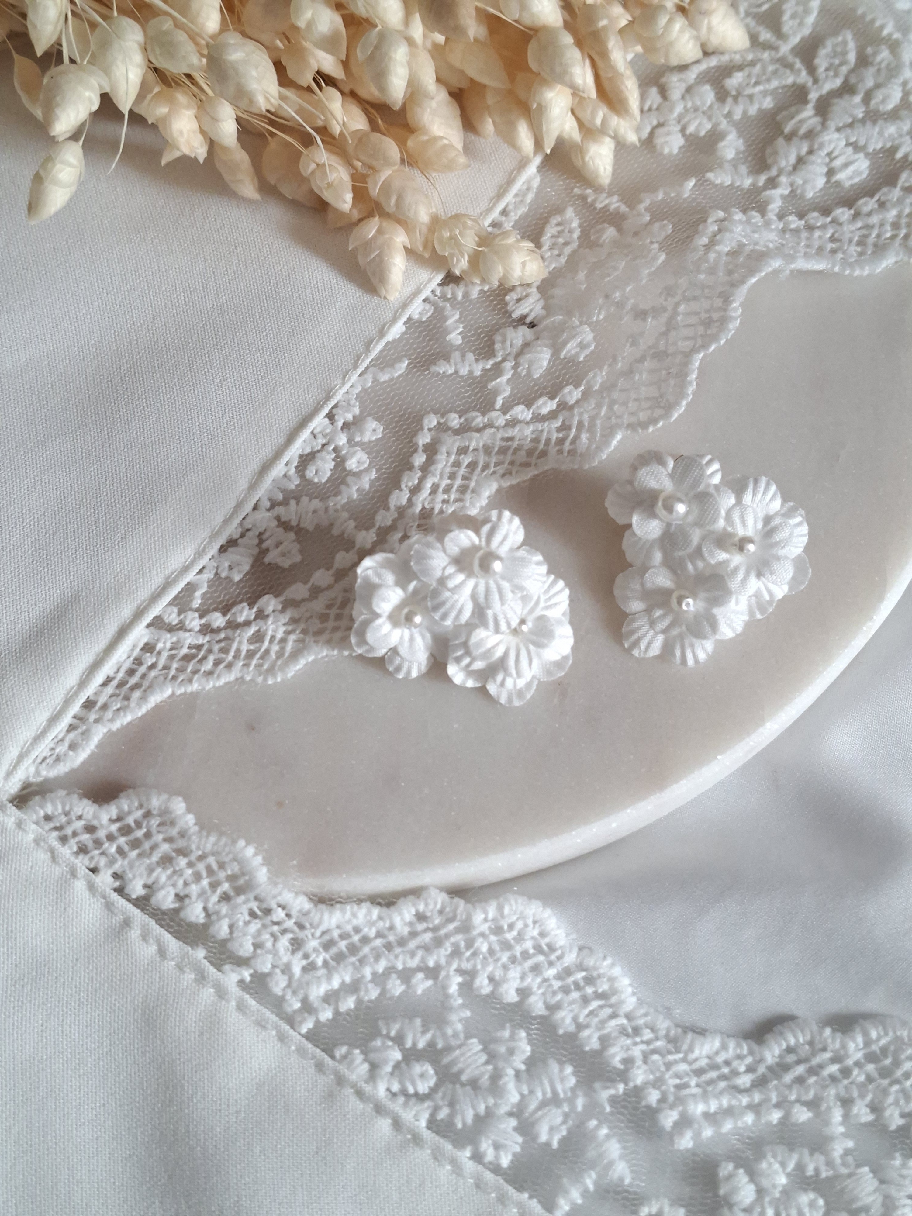 Délicates boucles d’oreilles proches de l’oreille, conçues spécialement pour les futures mariées en quête d’un bijou poétique, chic et intemporel. Réalisées entièrement à la main dans mon atelier, elles se composent d’un assemblage harmonieux de petites fleurs blanches en tissu, façonnées pétale par pétale pour un rendu réaliste et aérien.