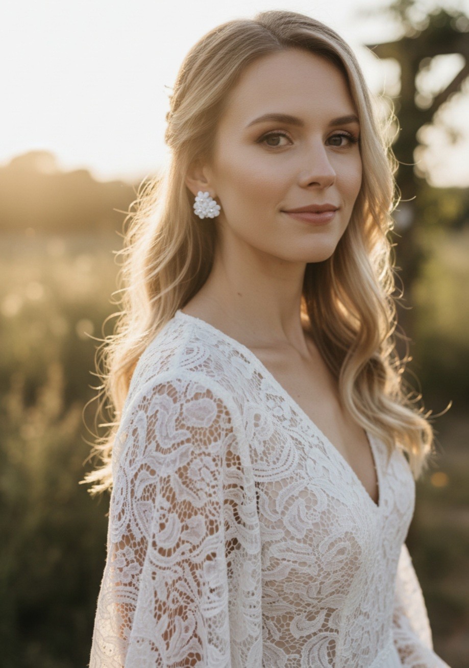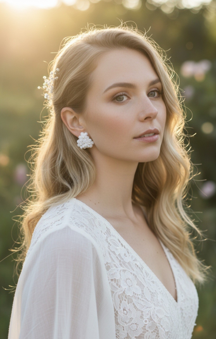Au cœur de chaque fleur, de petites perles nacrées blanches sont minutieusement brodées à la main, apportant une touche lumineuse et raffinée. Leur forme proche de l’oreille sublime le port de tête sans en faire trop : un parfait équilibre entre romantisme moderne et élégance discrète.