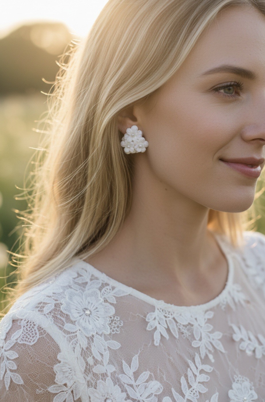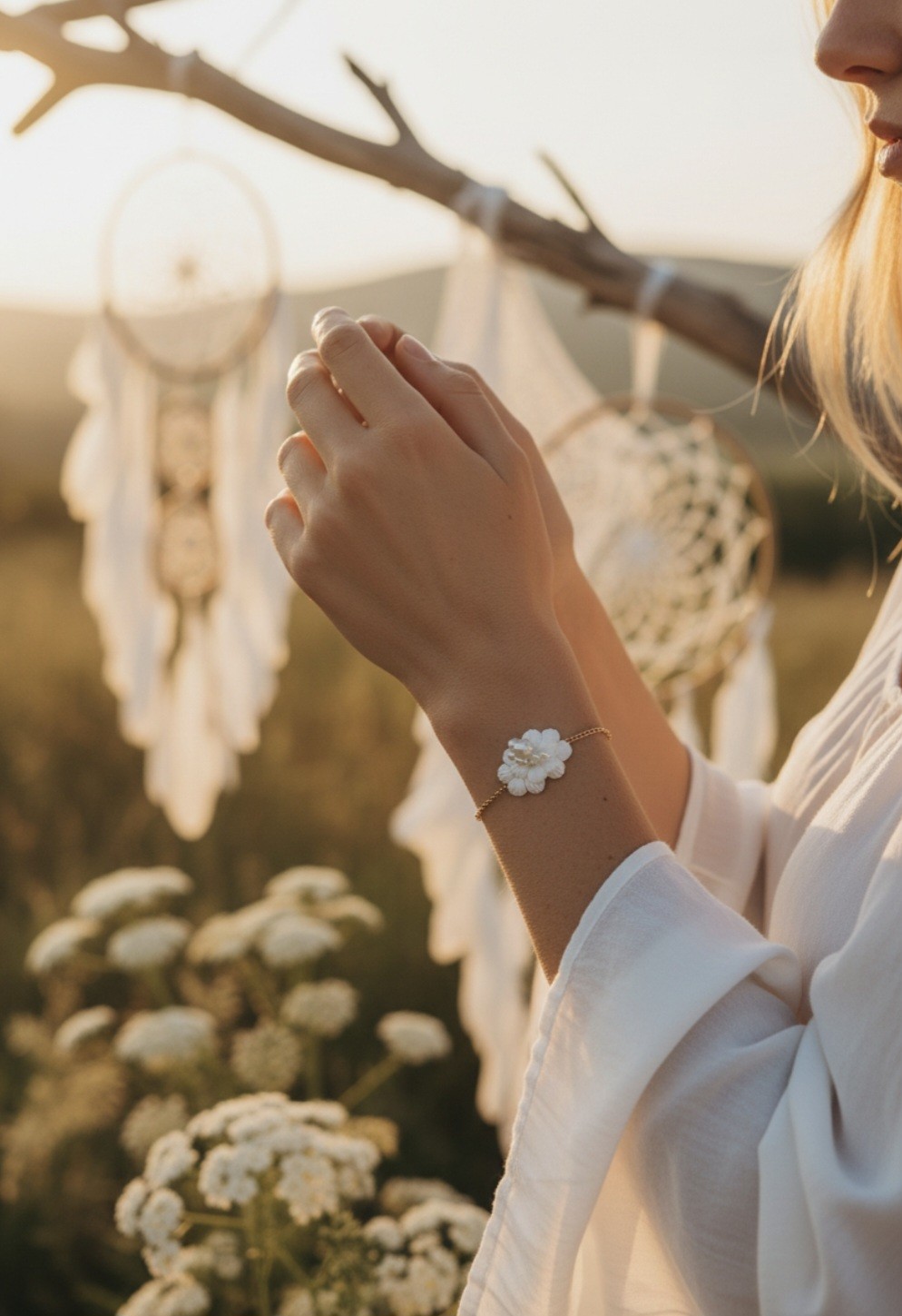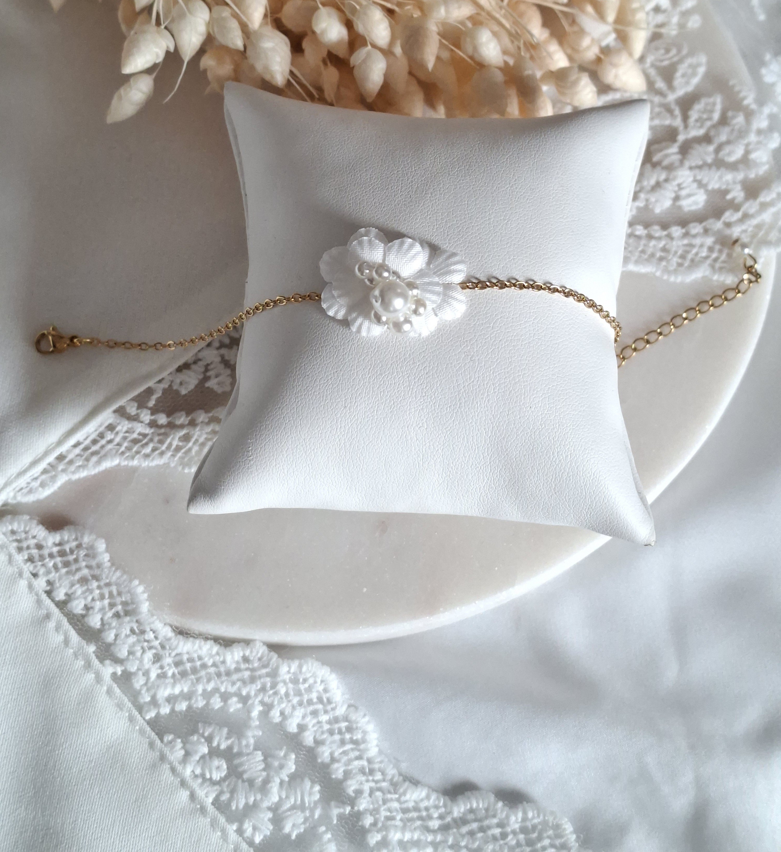 Laissez-vous séduire par ce délicat bracelet de mariée, imaginé et réalisé à la main dans mon atelier, pour accompagner avec poésie les boucles d’oreilles assorties. Conçu autour de petites fleurs blanches en tissu, minutieusement façonnées, il offre un rendu à la fois romantique, lumineux et très naturel.