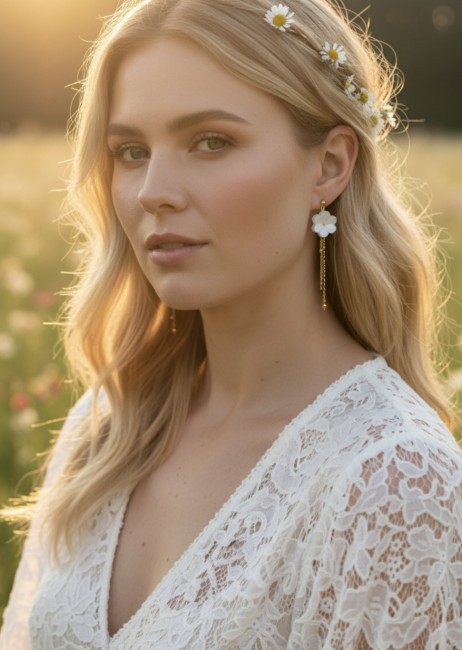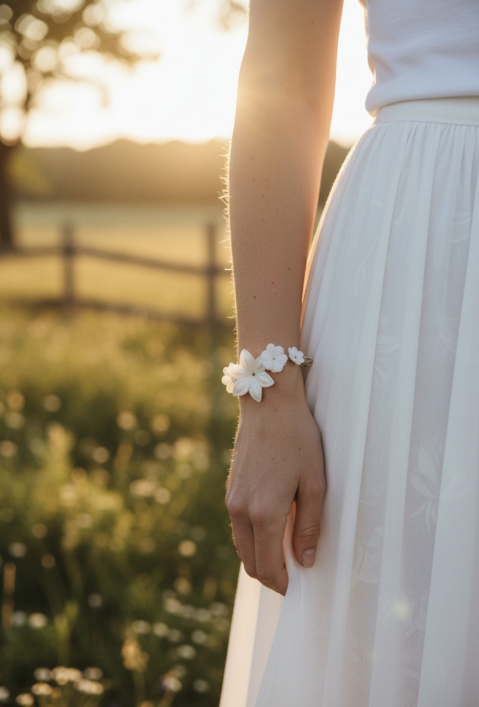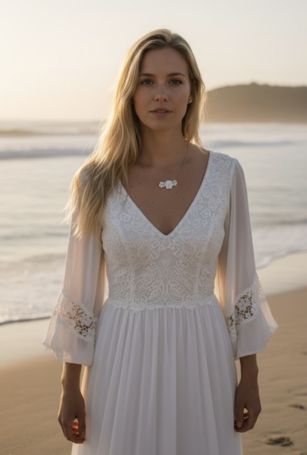 Ce collier a été conçu pour accompagner la mariée tout au long de sa journée, qu’elle adopte un style bohème chic, classique, moderne ou minimaliste. Les fleurs se déposent délicatement au creux du cou, apportant une touche lumineuse et raffinée sans jamais alourdir la silhouette.