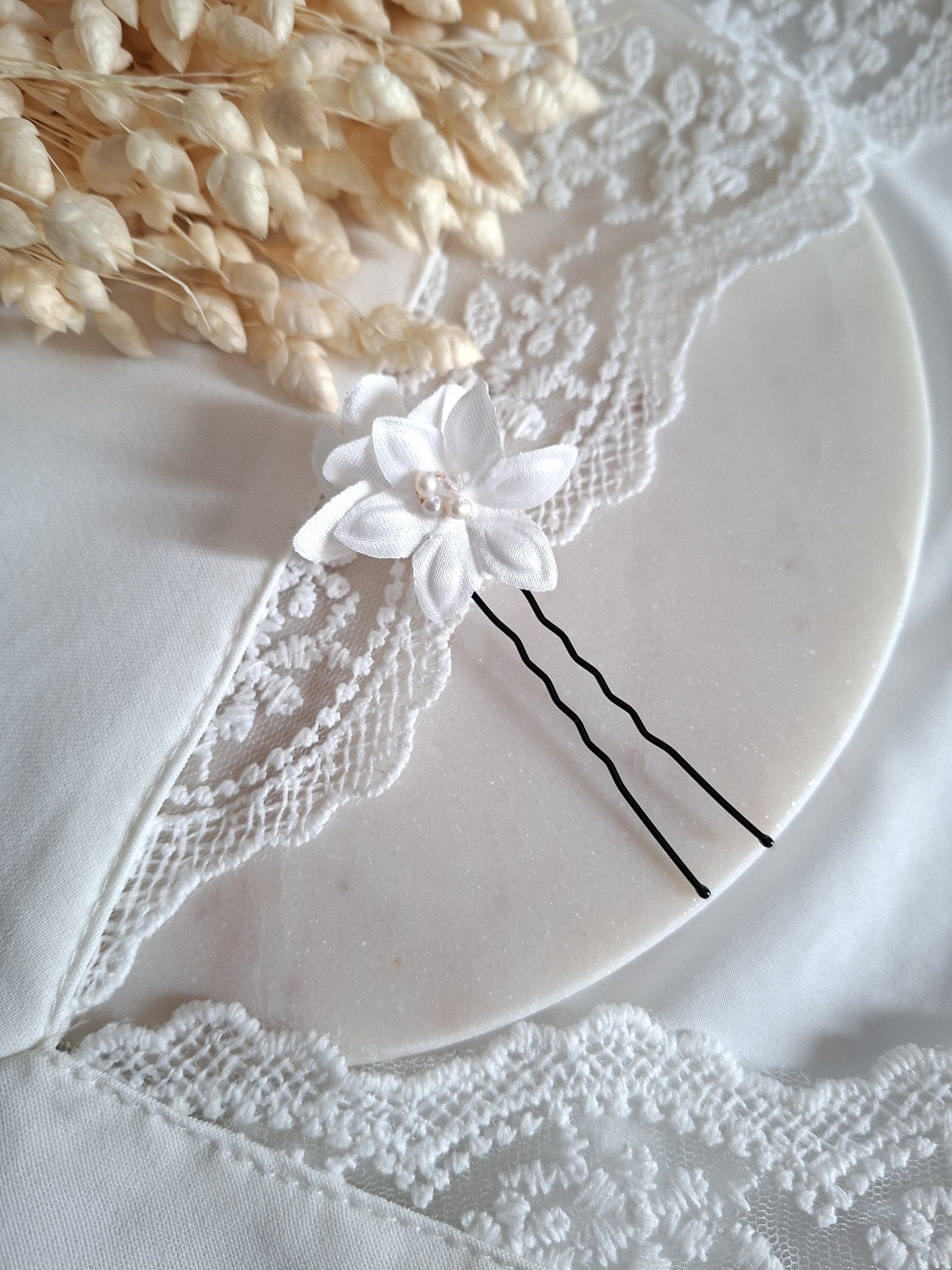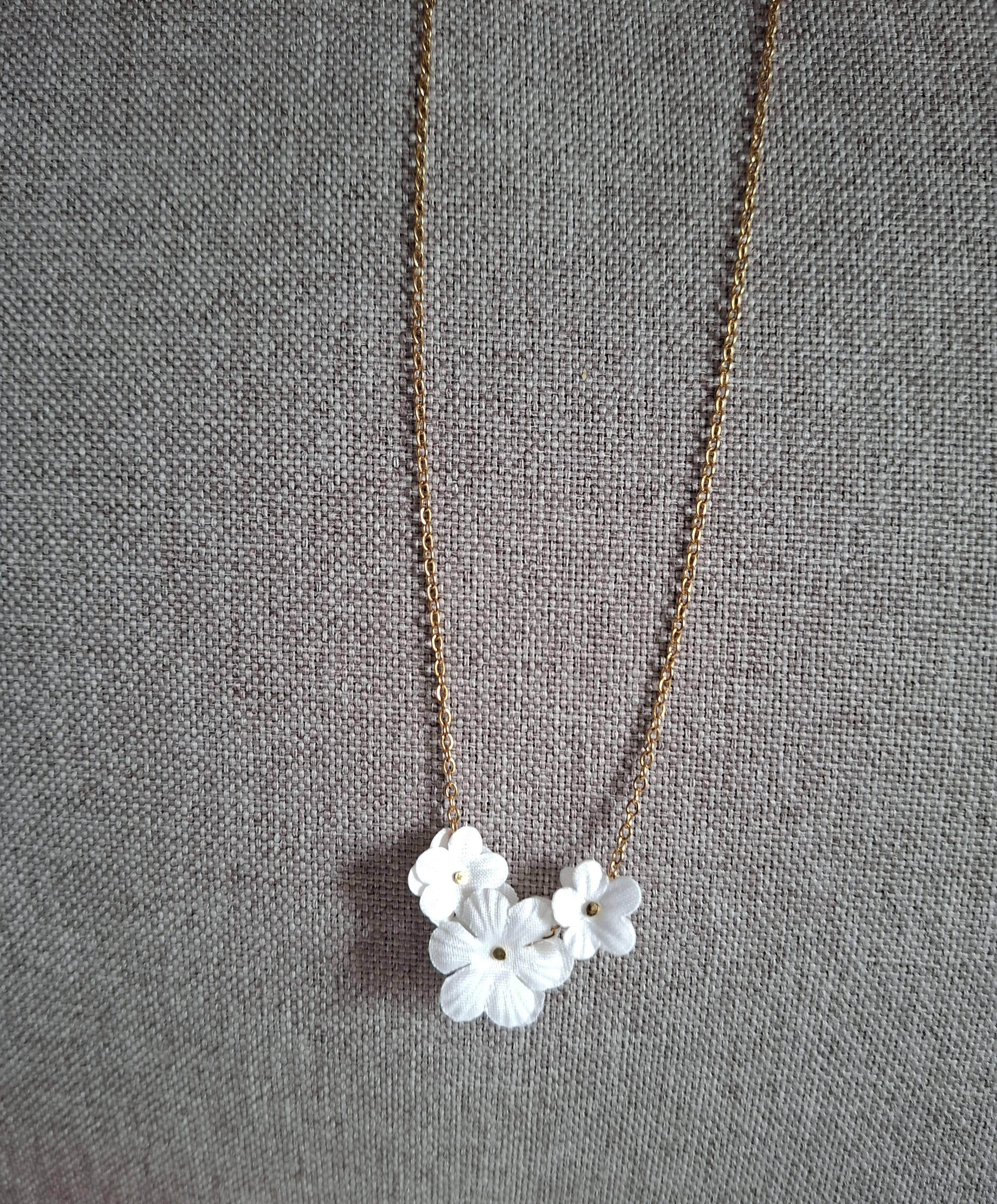 Collier de mariée d’une douceur exquise, entièrement réalisé à la main dans mon atelier. Ce bijou délicat met en valeur trois petites fleurs en tissu blanc, minutieusement assemblées pour créer un ensemble harmonieux, aérien et élégant. Chaque fleur, légère et subtilement texturée, évoque la pureté et la poésie d’un mariage romantique.