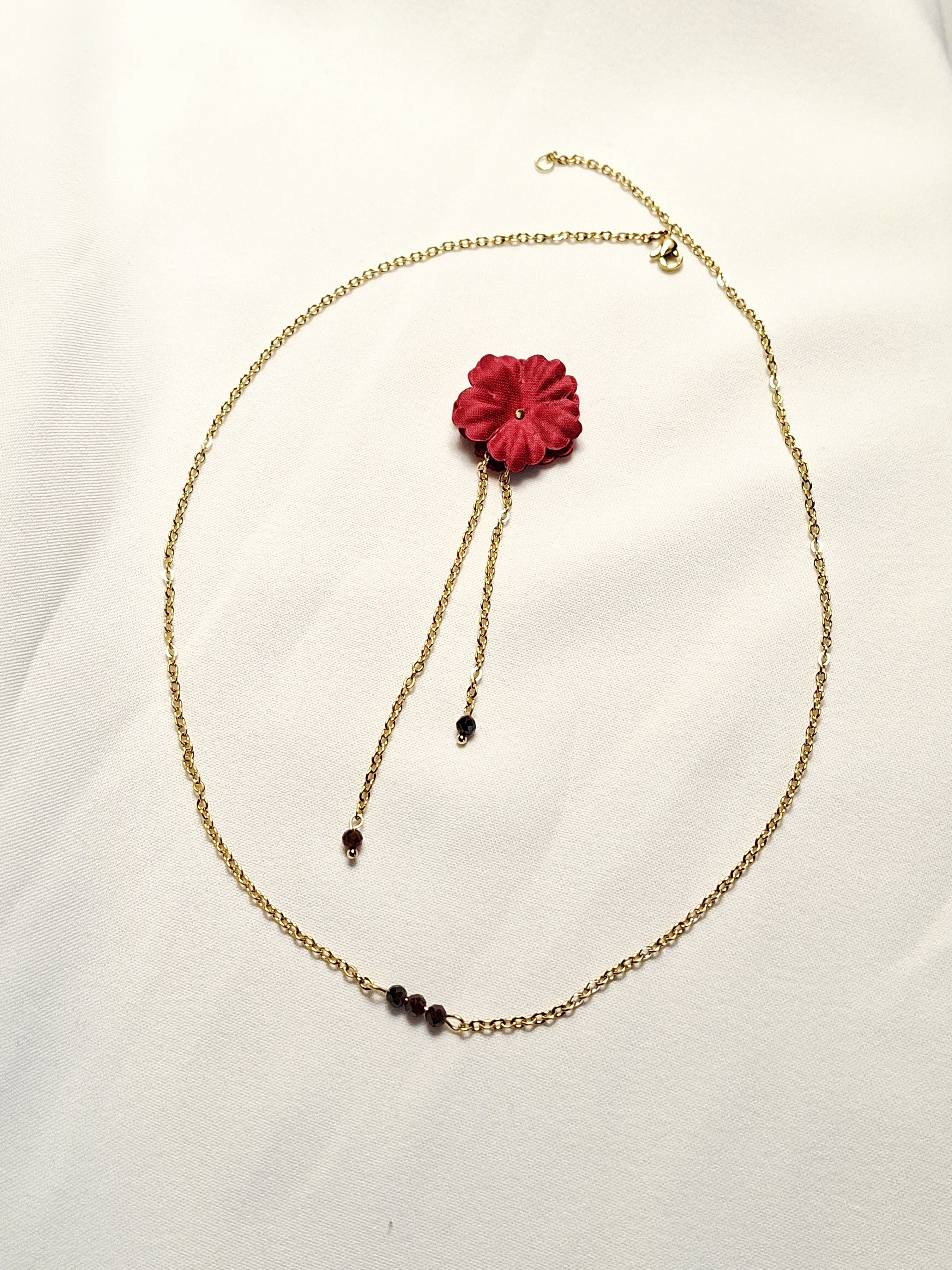 À l’avant, le collier est décoré de petites perles grenat–bordeaux de forme irrégulière, apportant un éclat discret et une belle harmonie avec les fleurs. Le dos reprend ce détail avec deux perles assorties, pour créer un fil conducteur visuel lorsque le bijou tombe délicatement le long du dos.
