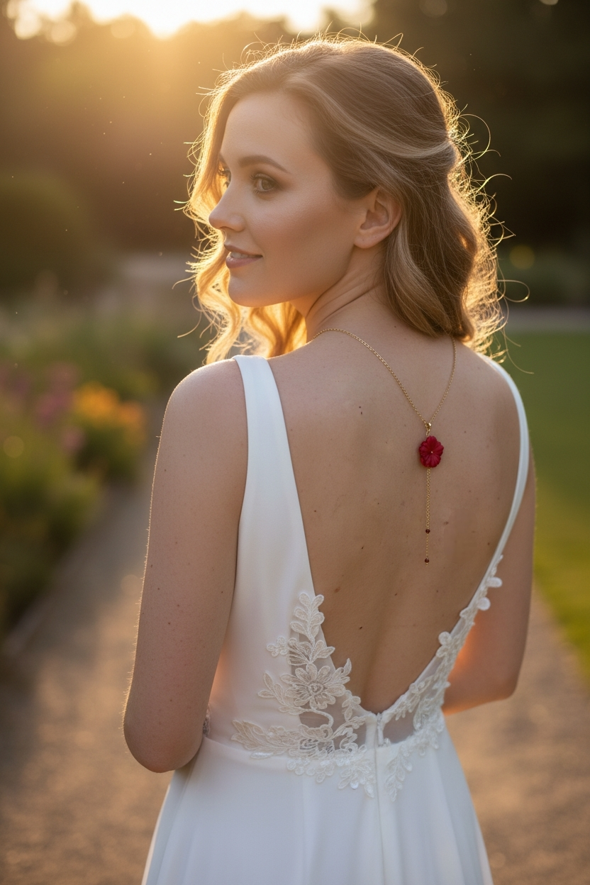 Ce collier de dos bordeaux est une création délicate imaginée pour accompagner les mariées qui souhaitent apporter une touche de chaleur et de romantisme à leur tenue. Réalisé à la main dans mon atelier, il est composé de petites fleurs en tissu bordeaux qui offrent une couleur profonde et élégante, idéale pour un mariage d’automne, d’hiver ou une cérémonie aux tons chaleureux.