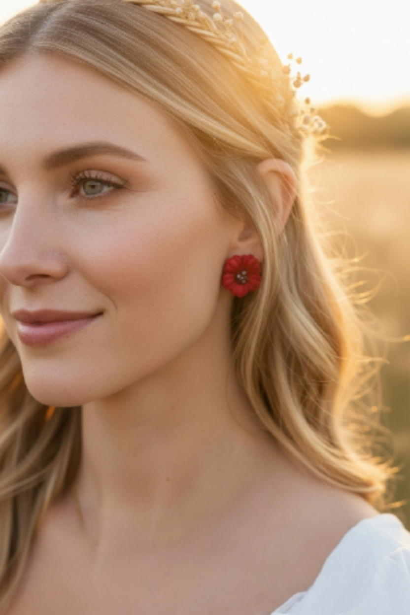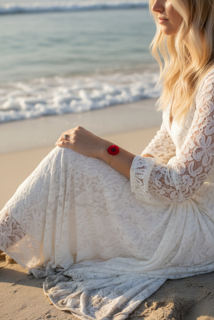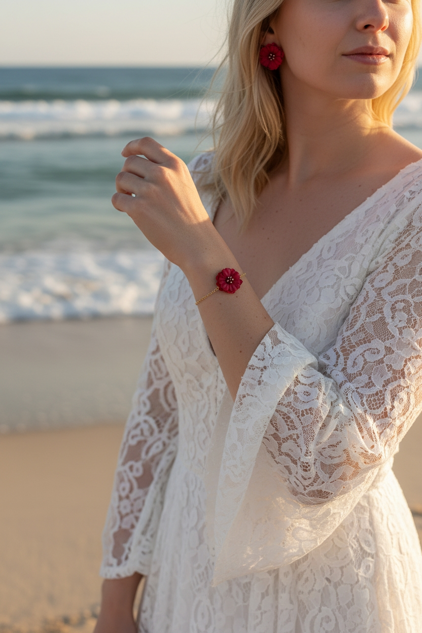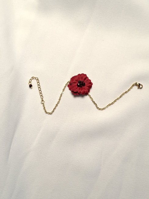 Ce bracelet raffiné est composé de petites fleurs en tissu bordeaux, réalisées et assemblées à la main dans mon atelier. Chaque fleur est brodée de perles en cristal dans des nuances grenat et bordeaux, créant un joli pistil irrégulier qui apporte du relief et une touche authentique.