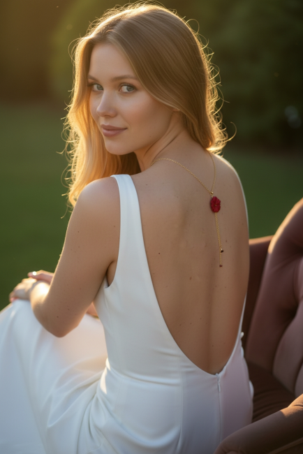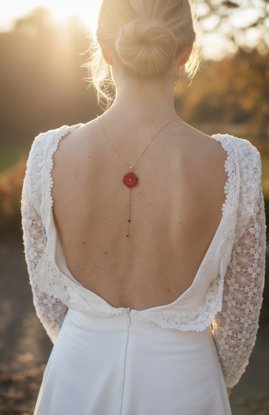 Complétez votre tenue avec le collier de dos amovible, le collier et les différentes boucles d’oreilles assortis, en vente sur le shop.