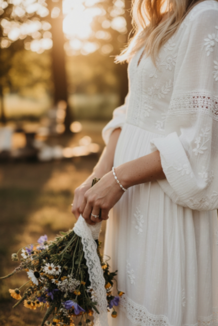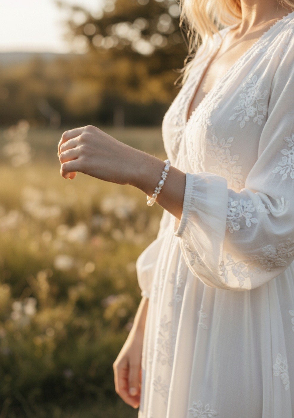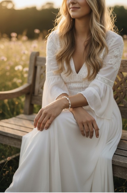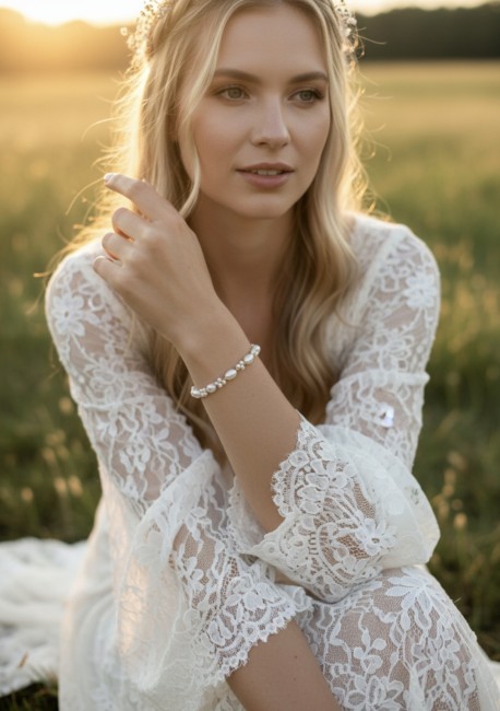La double rangée de perles épouse délicatement le poignet. Elle crée un joli relief tout en restant discrète et raffinée. Ce bracelet trouve naturellement sa place avec une tenue de mariage civil, un costume élégant ou une robe de mariée à l’esprit bohème, fluide et romantique.