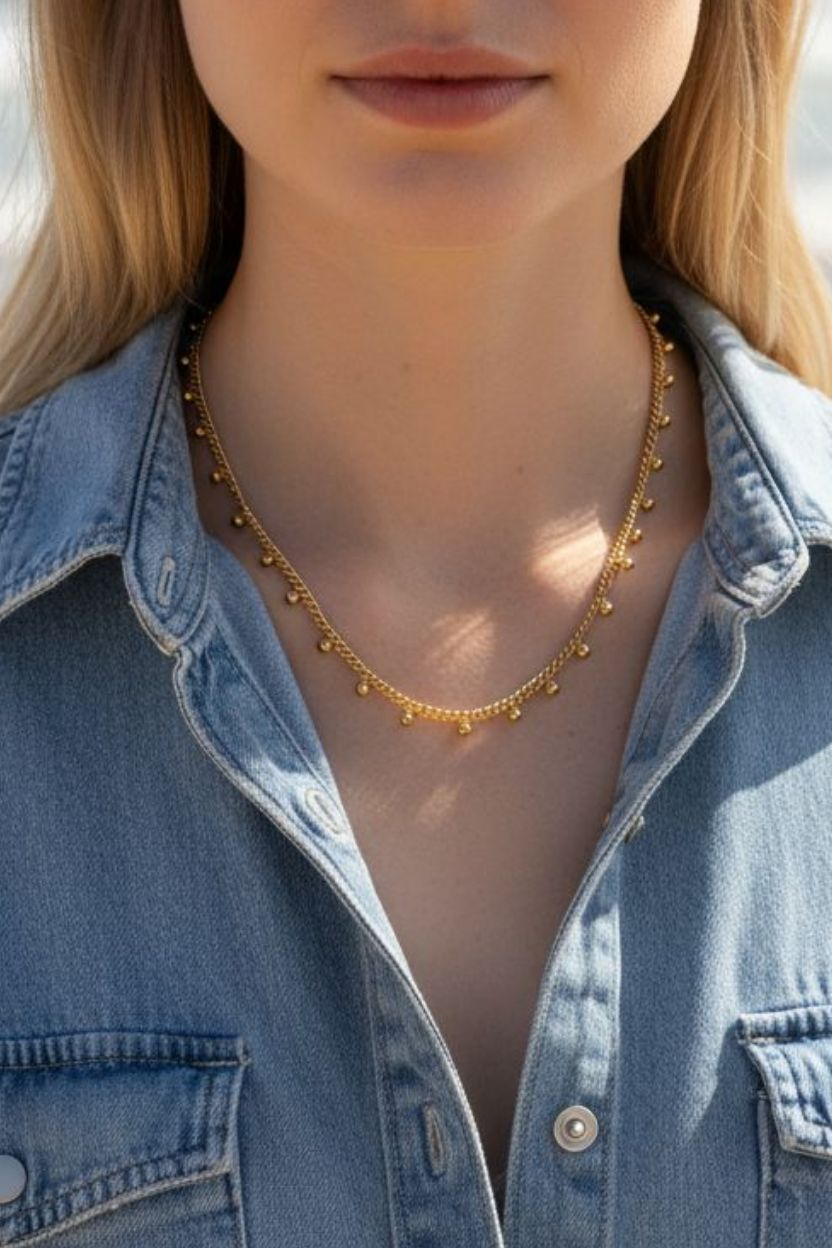 Ce collier minimaliste doré en acier inoxydable est un bijou tout en finesse, idéal à porter au quotidien. Sa délicate chaîne ornée de petites billes rondes reflète joliment la lumière et apporte une touche de brillance subtile à votre cou.