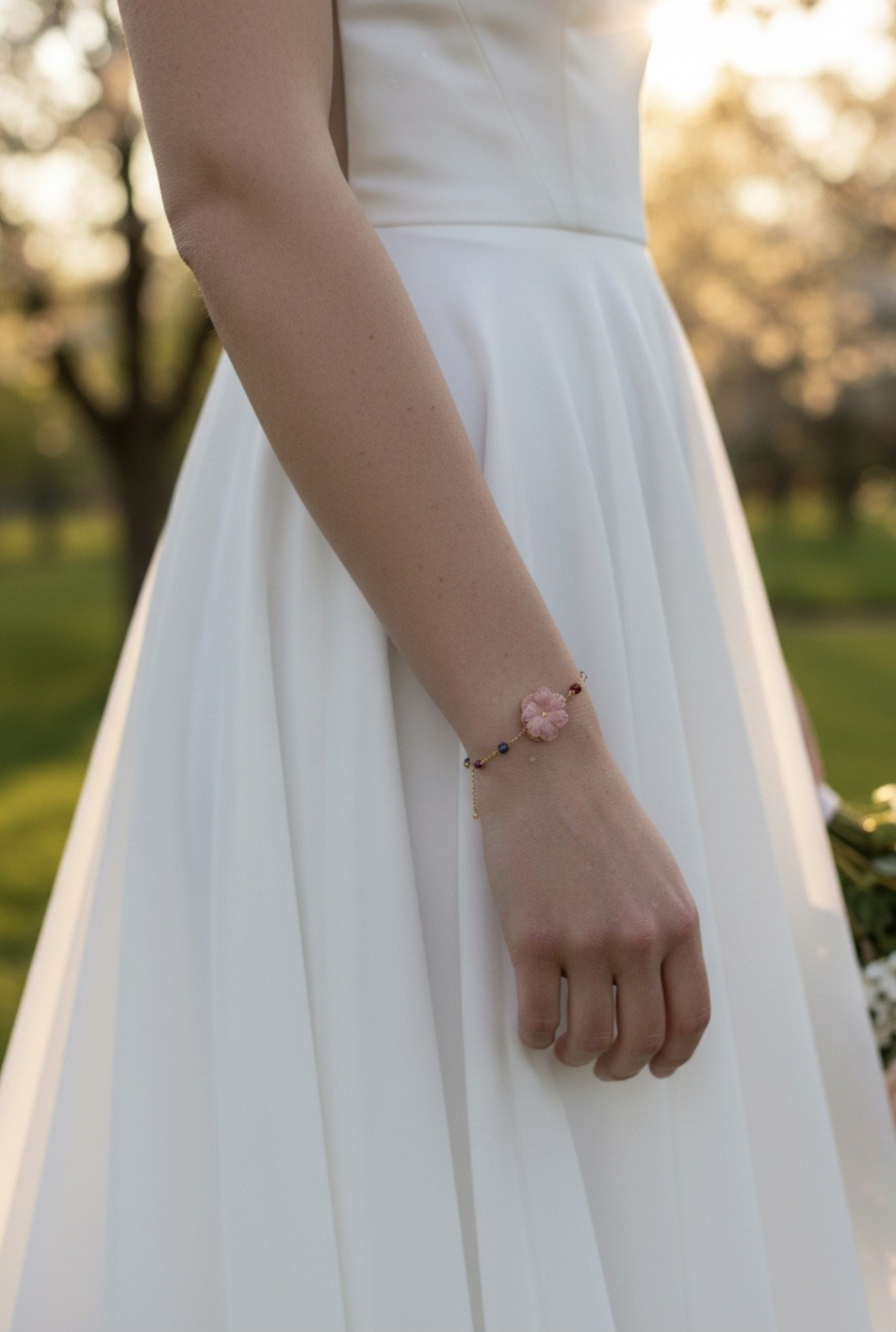 De chaque côté de la fleur, deux petites perles soigneusement brodées en bordeaux profond et rose givré, apportent une touche de lumière et de caractère. Le bracelet est monté sur une chaîne en acier inoxydable de haute qualité, au choix argentée ou dorée, et propose une longueur ajustable pour s’adapter à chaque poignet.