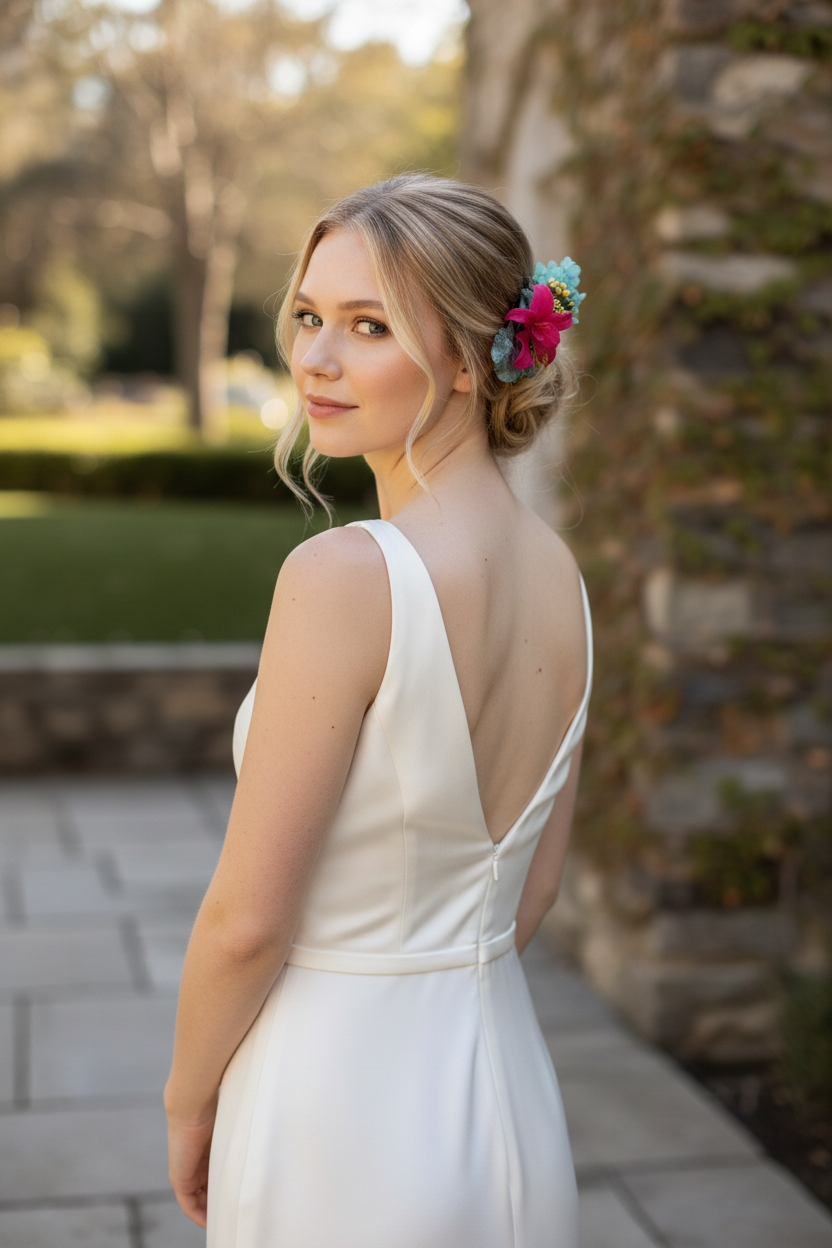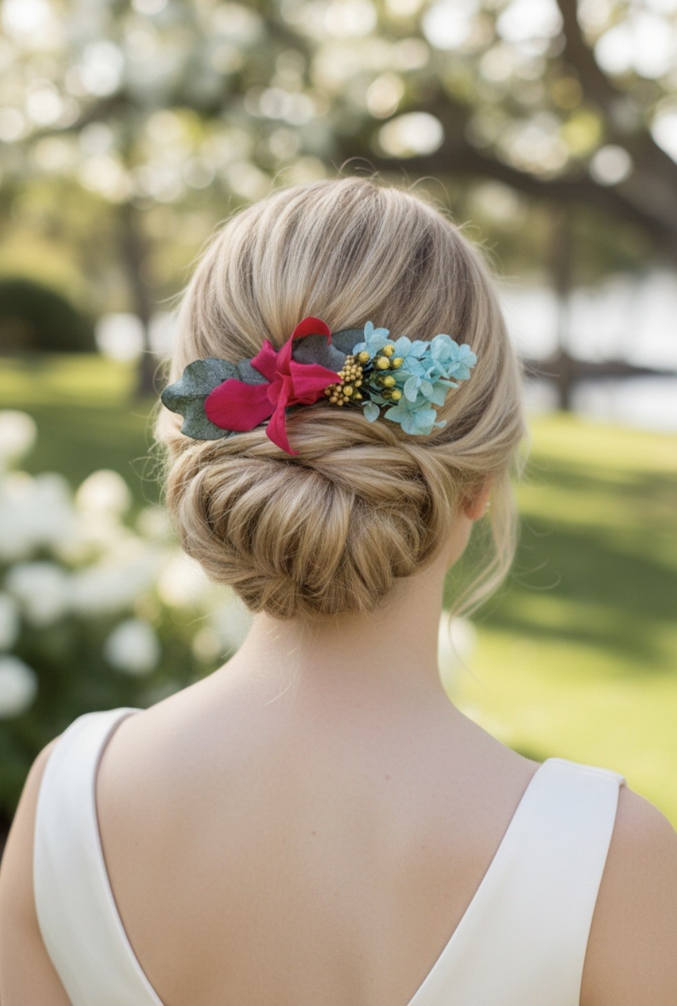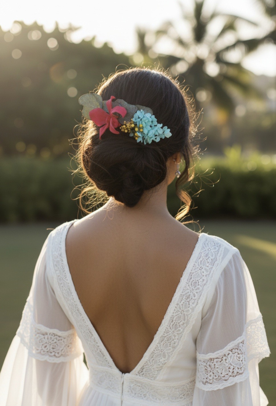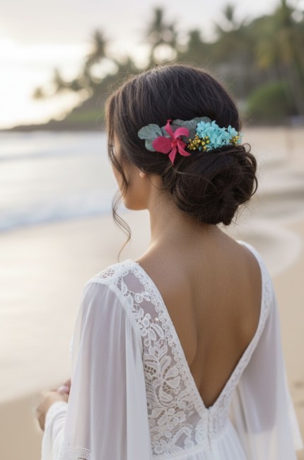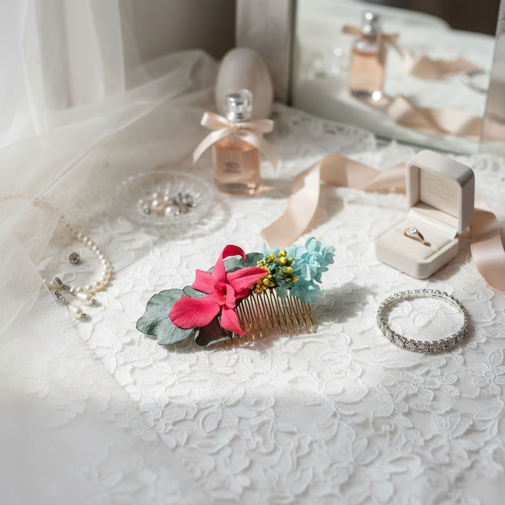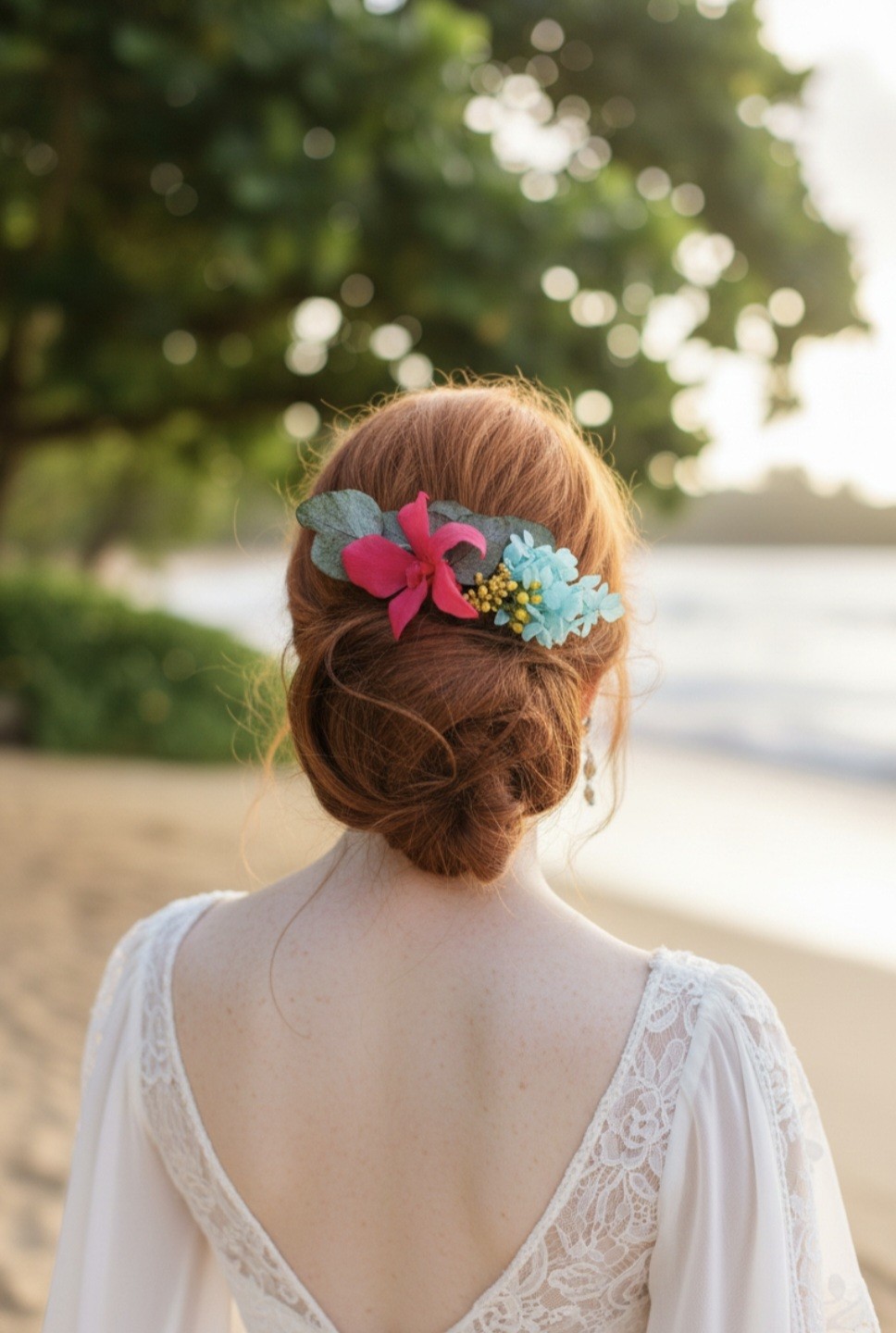 Ce magnifique peigne bohème est une création florale entièrement réalisée à la main, pensée pour sublimer les coiffures de mariée ou de demoiselle d’honneur avec délicatesse et caractère.