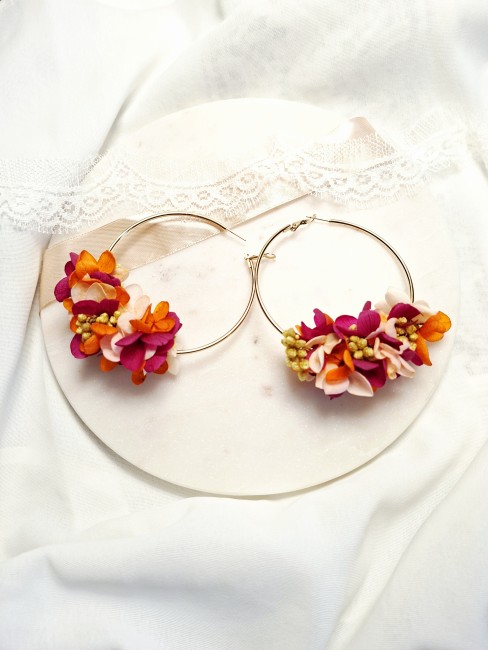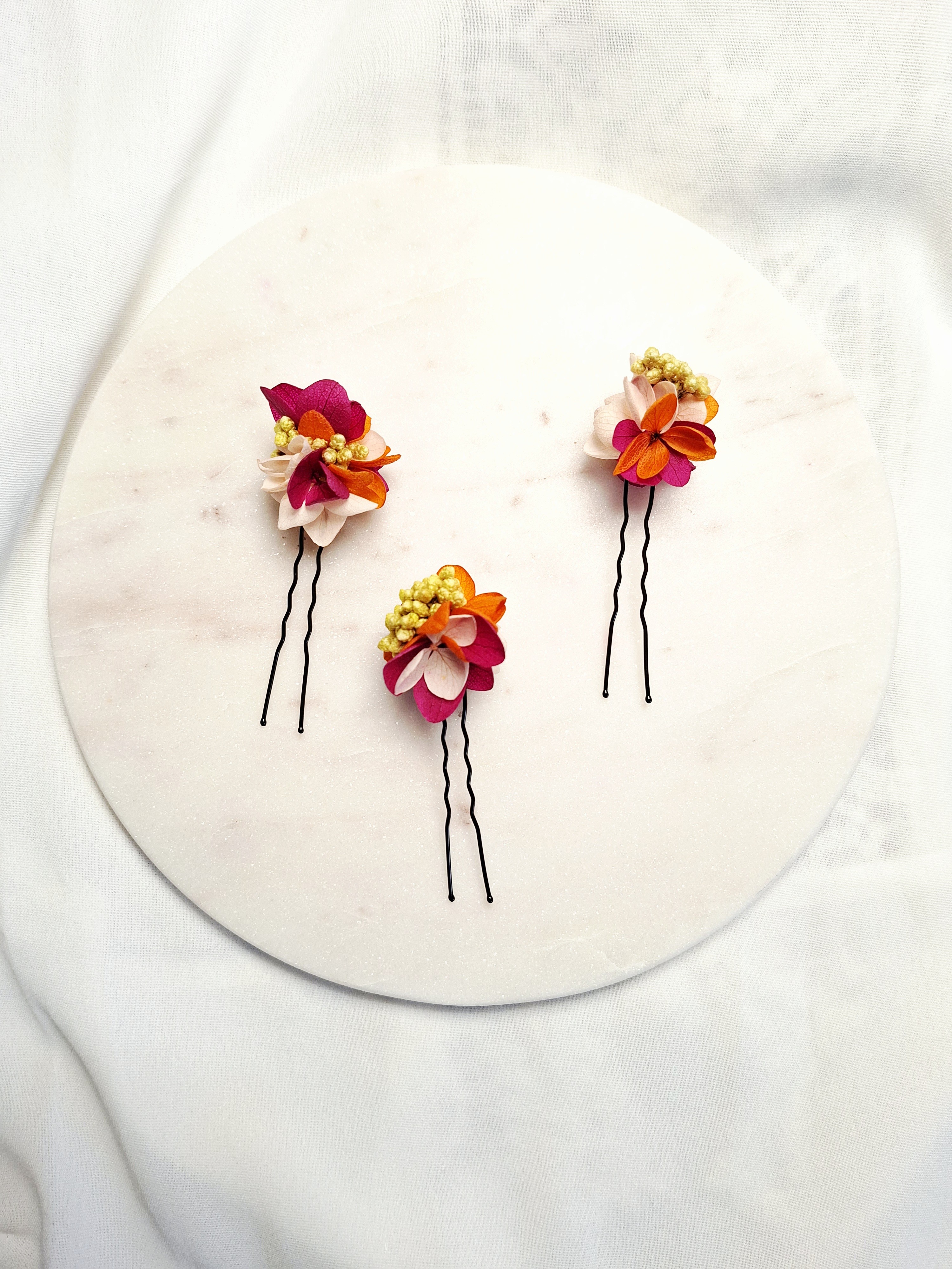 3 épingles de chignon mariée à fleurs préservées- couleurs vibrantes- fuchsia, orange, jaune, rose givré- coiffure fleurie bohème et romantique- fait main.