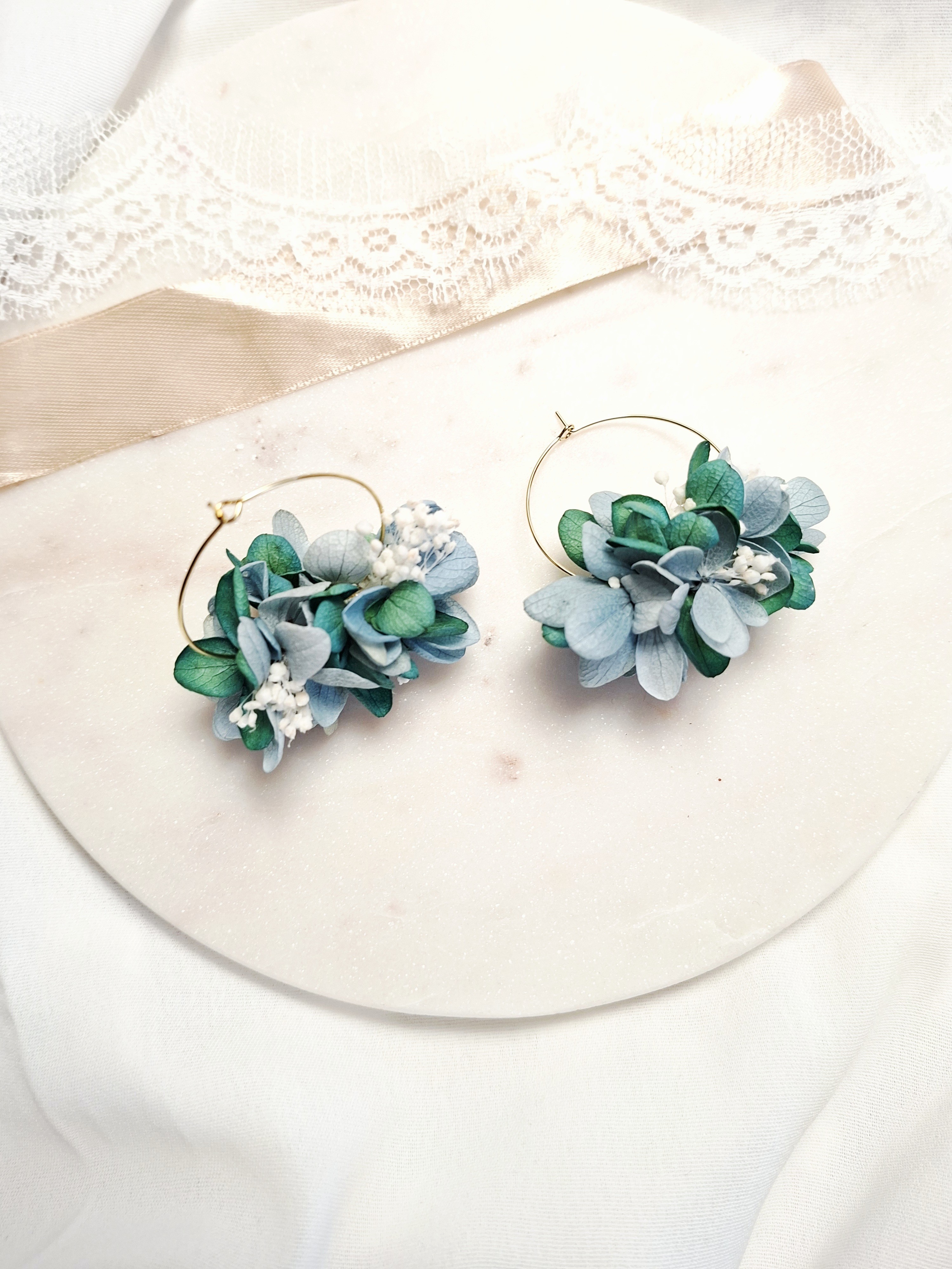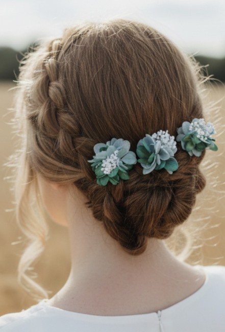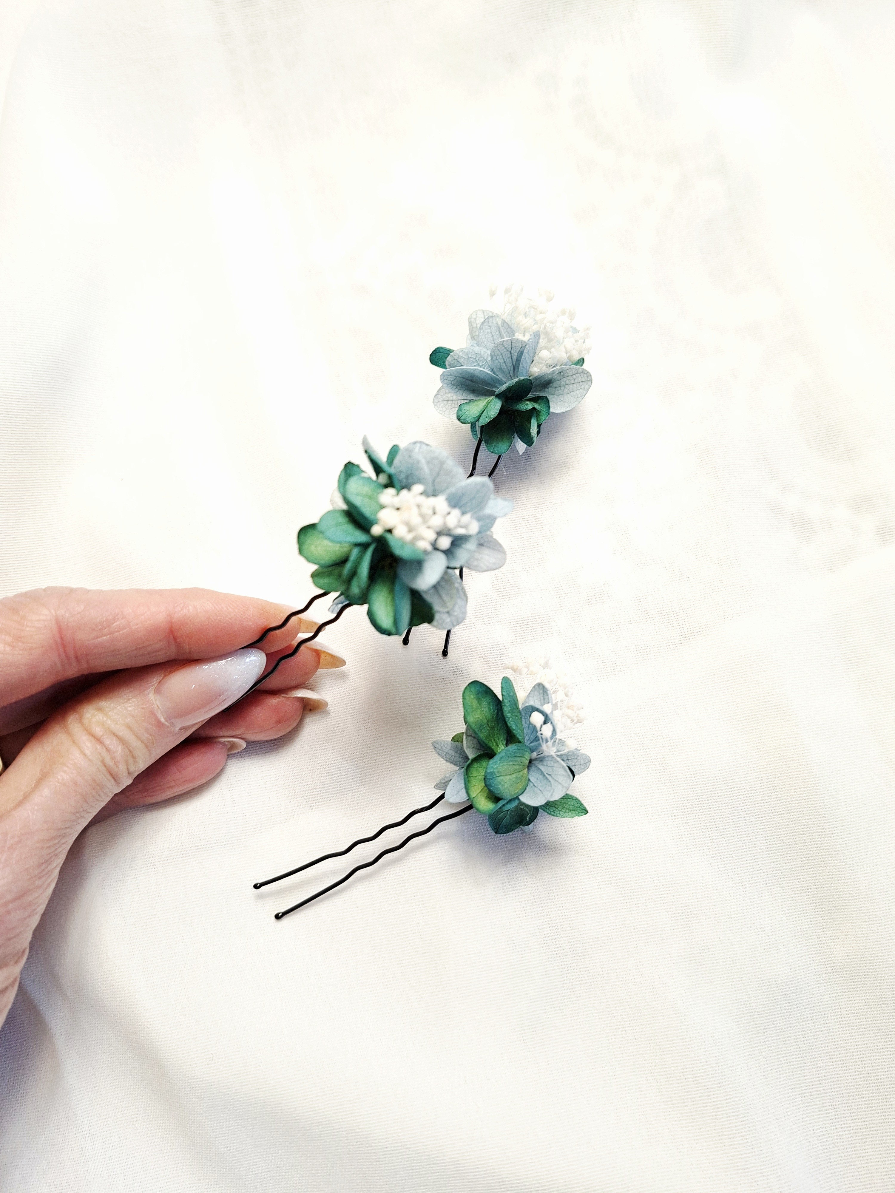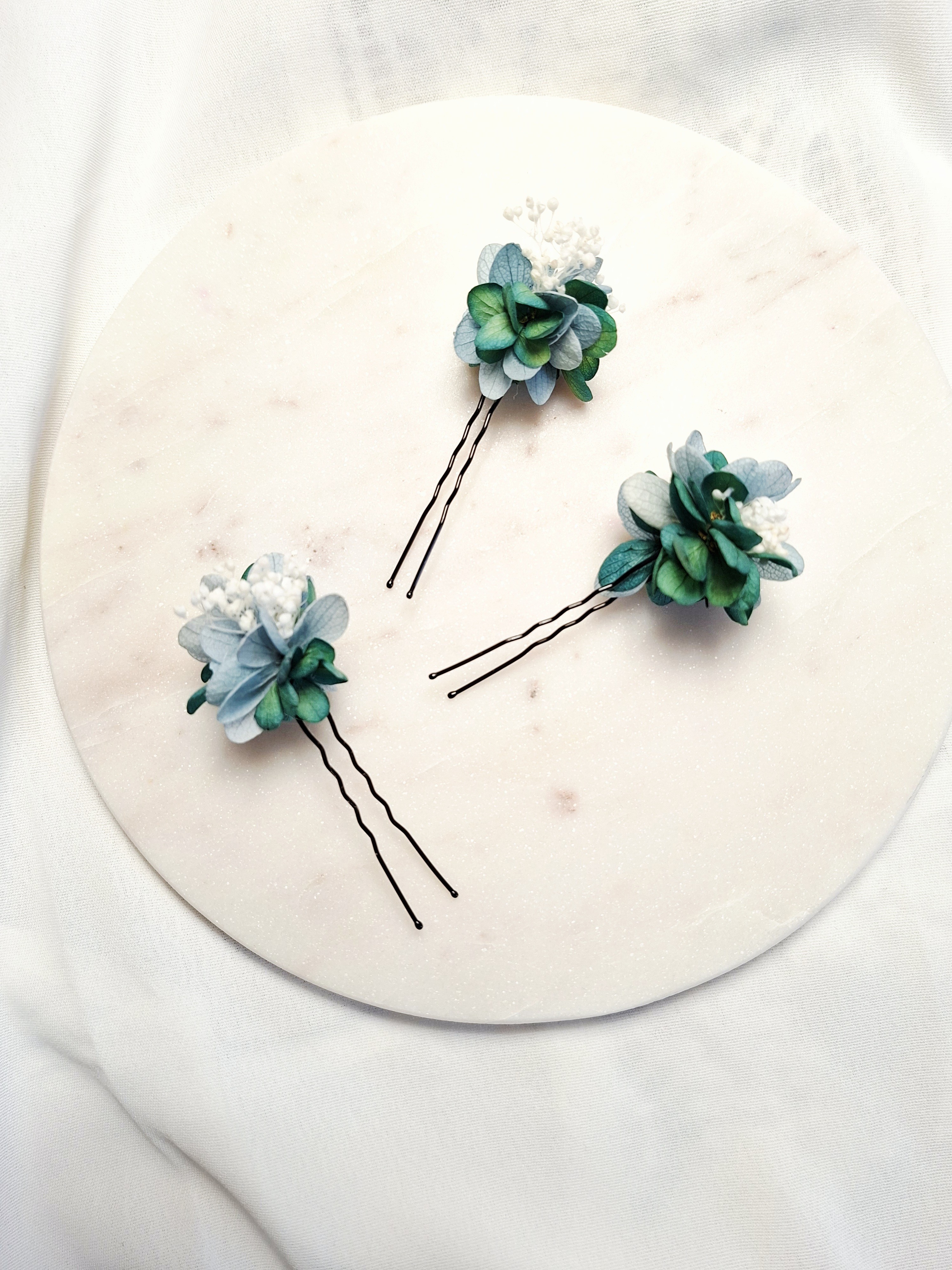 Trois épingles à chignon de mariée- fleurs stabilisées d'hortensias bleu, vert de bronze antique- Gypsophile blanc.