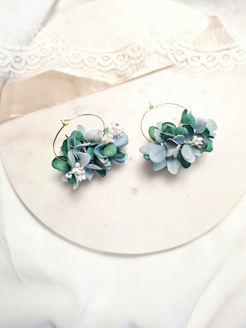 Créoles mariage à fleurs bleu- vert de bronze- bijoux de mariage- anneaux ornés de fleurs d’hortensias préservées- végétaux séchés.