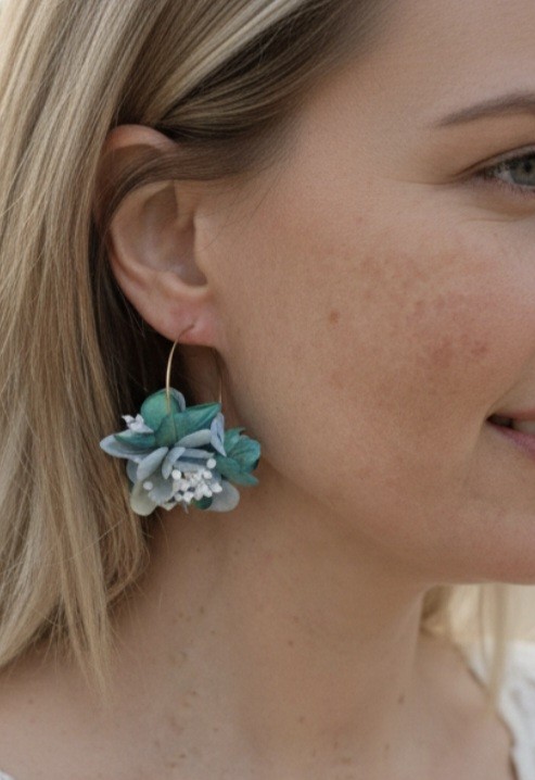 Ces boucles d’oreilles montées en Créoles sont réalisées dans notre atelier français de Seine-et-Marne avec de véritables fleurs naturelles d'hortensias dans des tons de bleu tamisé, bleu cuivré et nuances de vert de bronze.