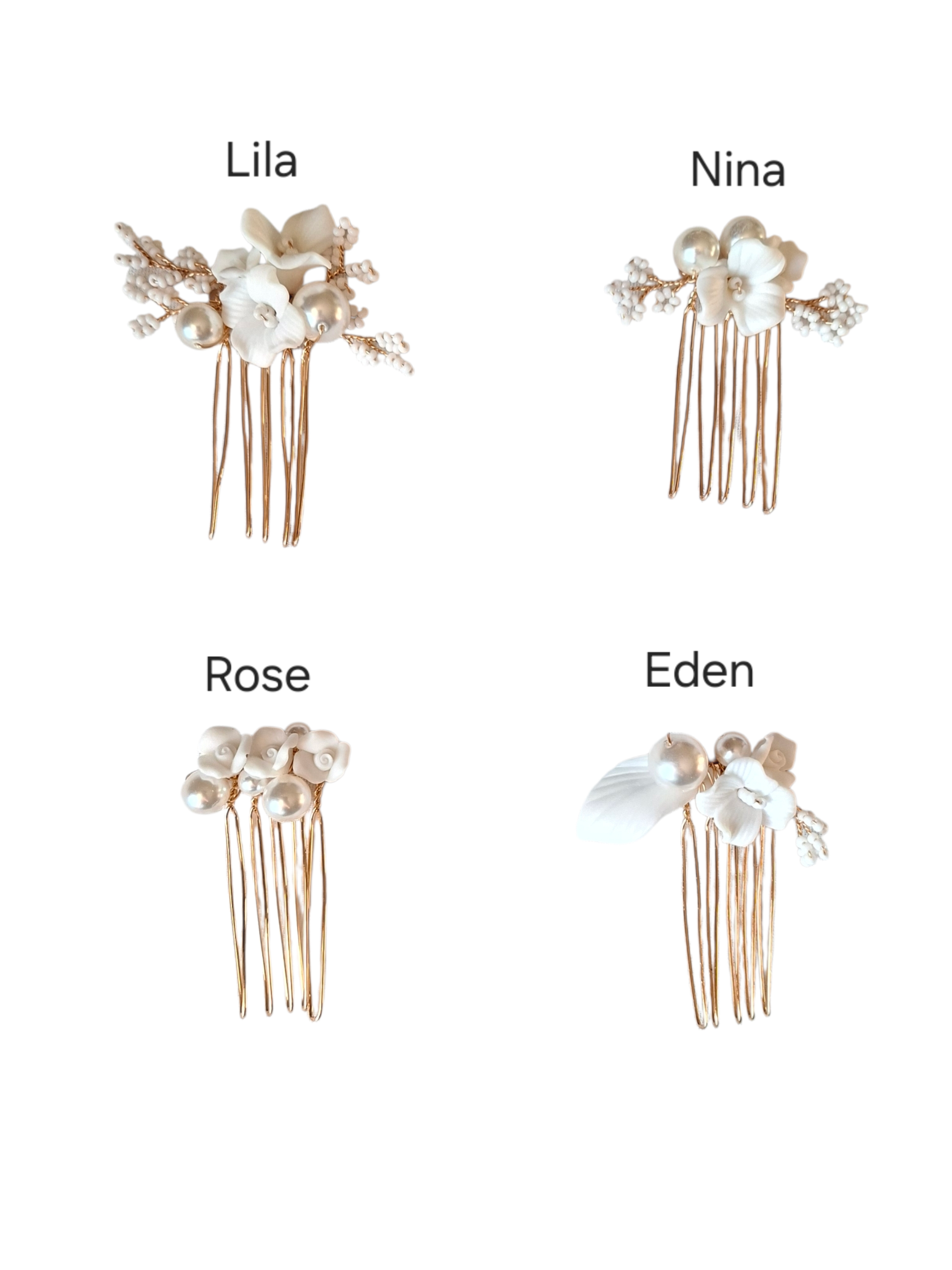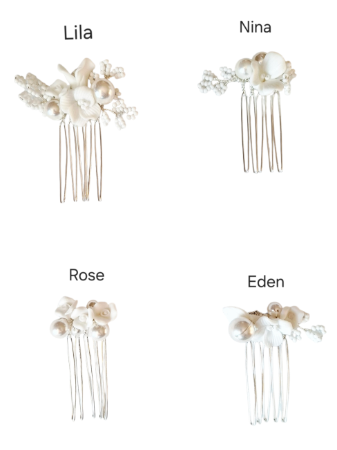 Ce modèle se décline en quatre versions différentes, allant d’un style minimaliste et épuré à des compositions légèrement plus travaillées, intégrant des fleurs variées pour un rendu plus riche et poétique. Chaque peigne possède son propre caractère tout en conservant une harmonie élégante et naturelle.
