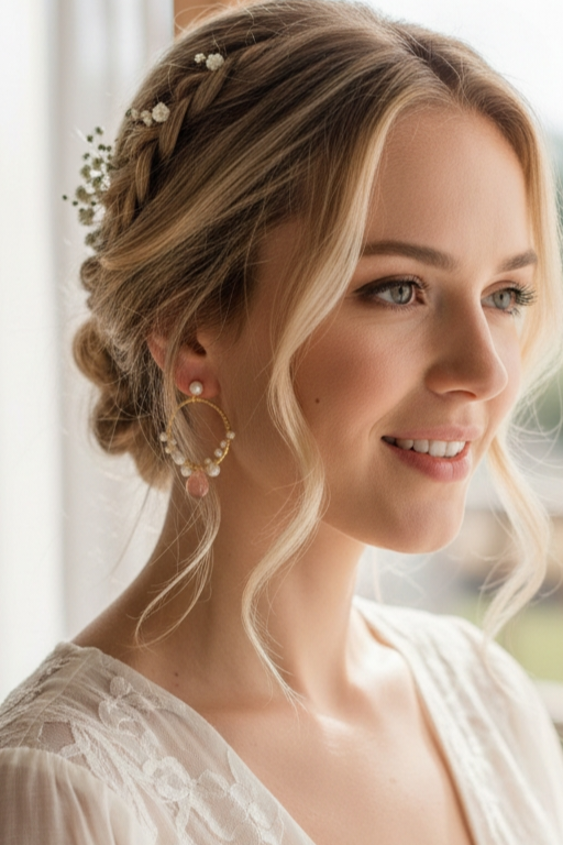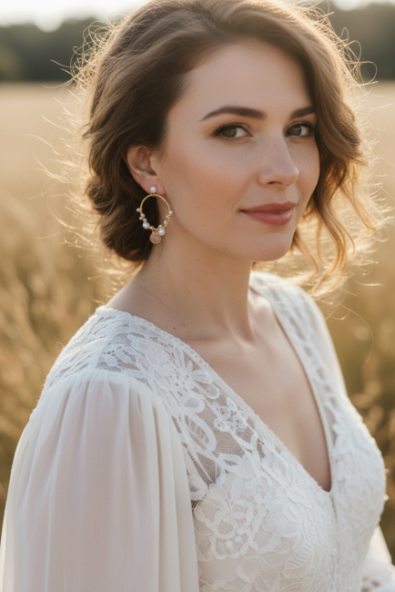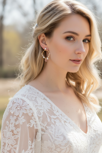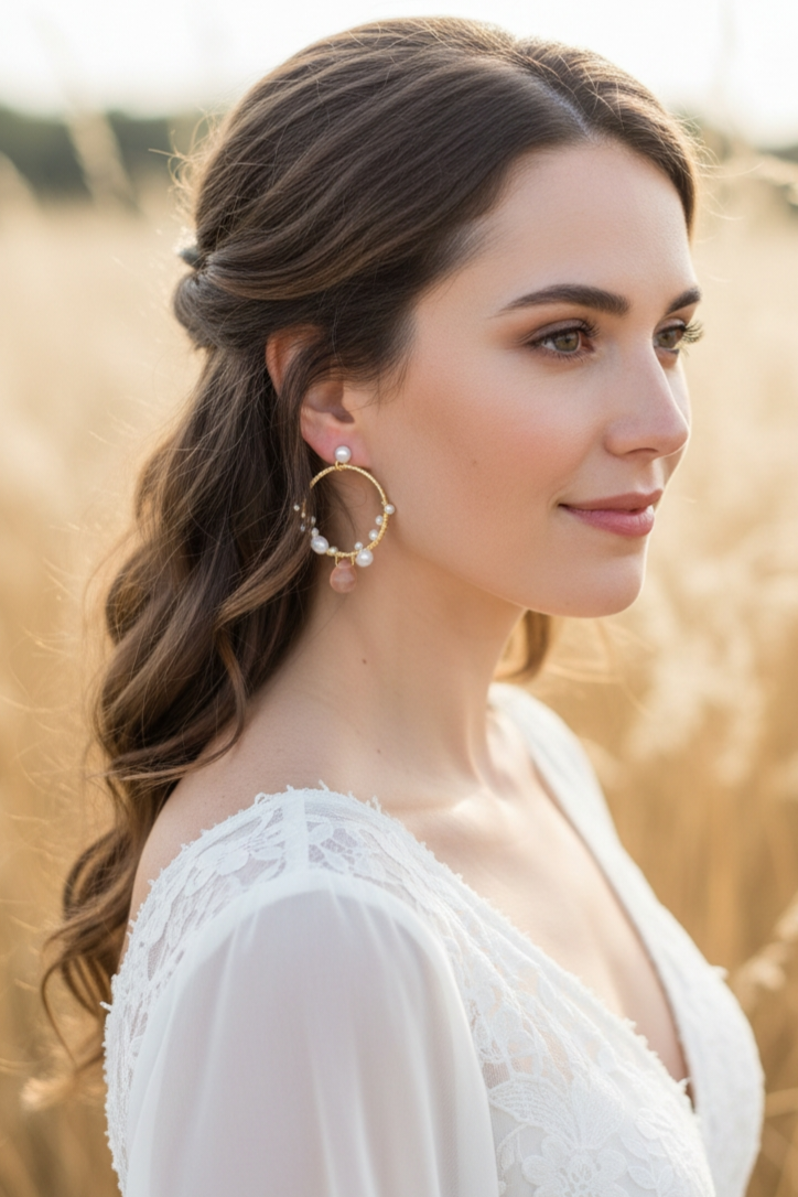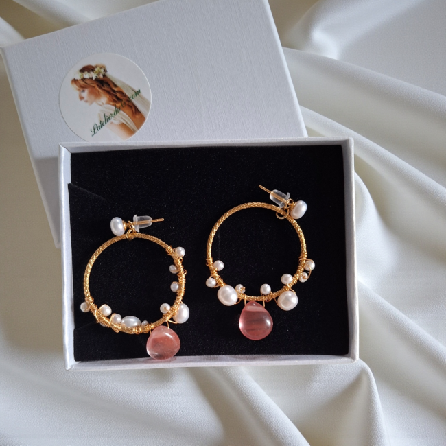 Les perles sont sublimées par de fines gouttes de pierres Watermelon, des gemmes naturelles aux nuances subtiles de pêche, de vieux rose et de tons rosés poudrés. Cette palette douce et lumineuse apporte une touche de fraîcheur, de féminité et de modernité, parfaite pour accompagner aussi bien une tenue quotidienne qu’une tenue de cérémonie ou de mariage.