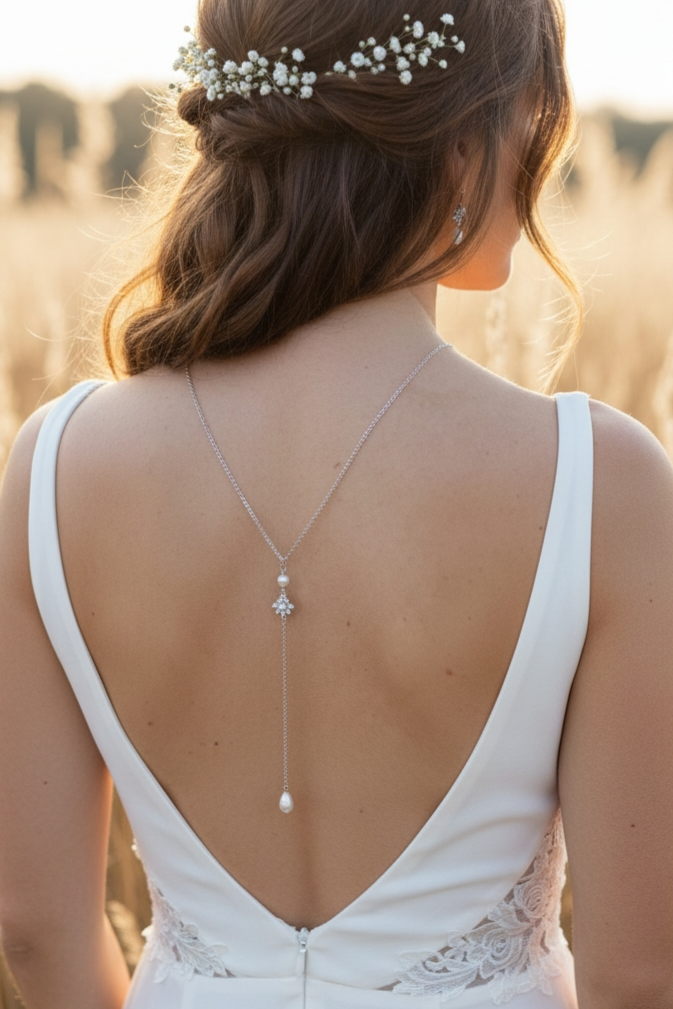 Cette parure de bijoux de mariage s’adresse aux futures mariées recherchant une parure élégante, un collier de dos pour robe dos nu, un bijou minimaliste chic, une création artisanale française et un accessoire de mariage haut de gamme.