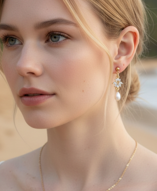 Chaque boucle est ornée d’une perle goutte blanche, sélectionnée pour sa douceur, sa lumière naturelle et son élégance intemporelle. Ce détail délicat capte subtilement la lumière et illumine le visage, créant un équilibre parfait entre discrétion et sophistication. Leur design épuré permet de s’accorder facilement avec une robe de mariée minimaliste, bohème chic, romantique ou contemporaine.