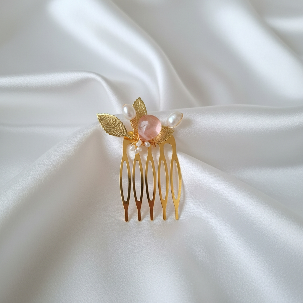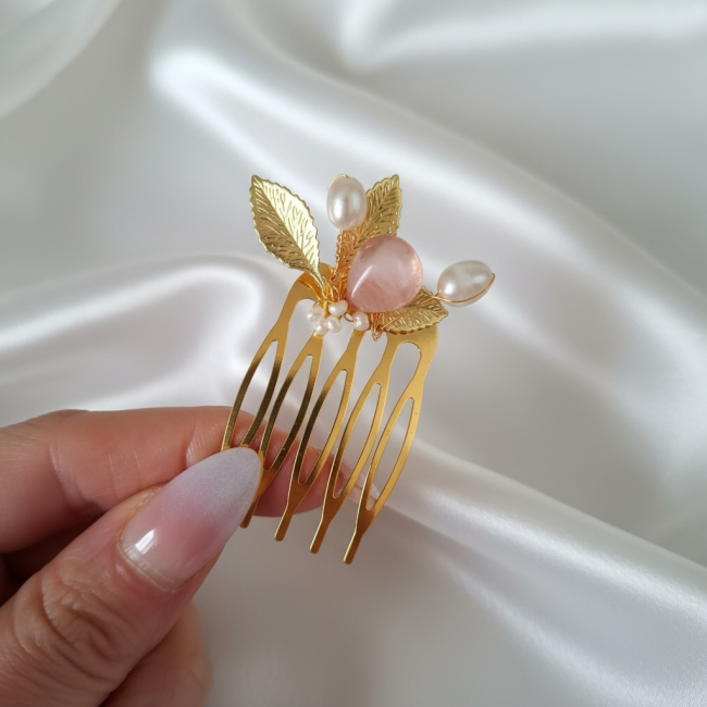 Orné d’une goutte de pierre Watermelon aux nuances subtiles de pêche, de vieux rose et de tons rosés poudrés, ce peigne capte naturellement la lumière et apporte douceur et féminité à la coiffure. La pierre naturelle est sublimée par des perles de culture blanches, sélectionnées pour leur éclat délicat, leur forme organique et leur caractère unique.