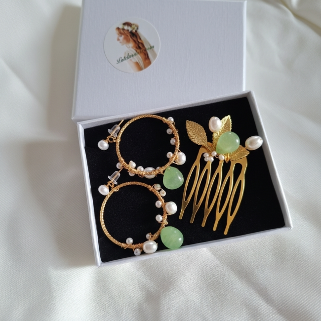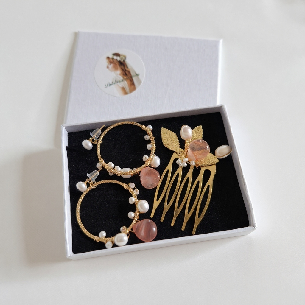 Ce petit peigne décoratif a été imaginé comme un écho délicat aux créoles martelées ornées de perles de culture et de pierres Watermelon. Il prolonge l’harmonie de la collection en apportant une touche lumineuse et raffinée à la coiffure, idéale pour une mariée, une cérémonie élégante ou un événement précieux.