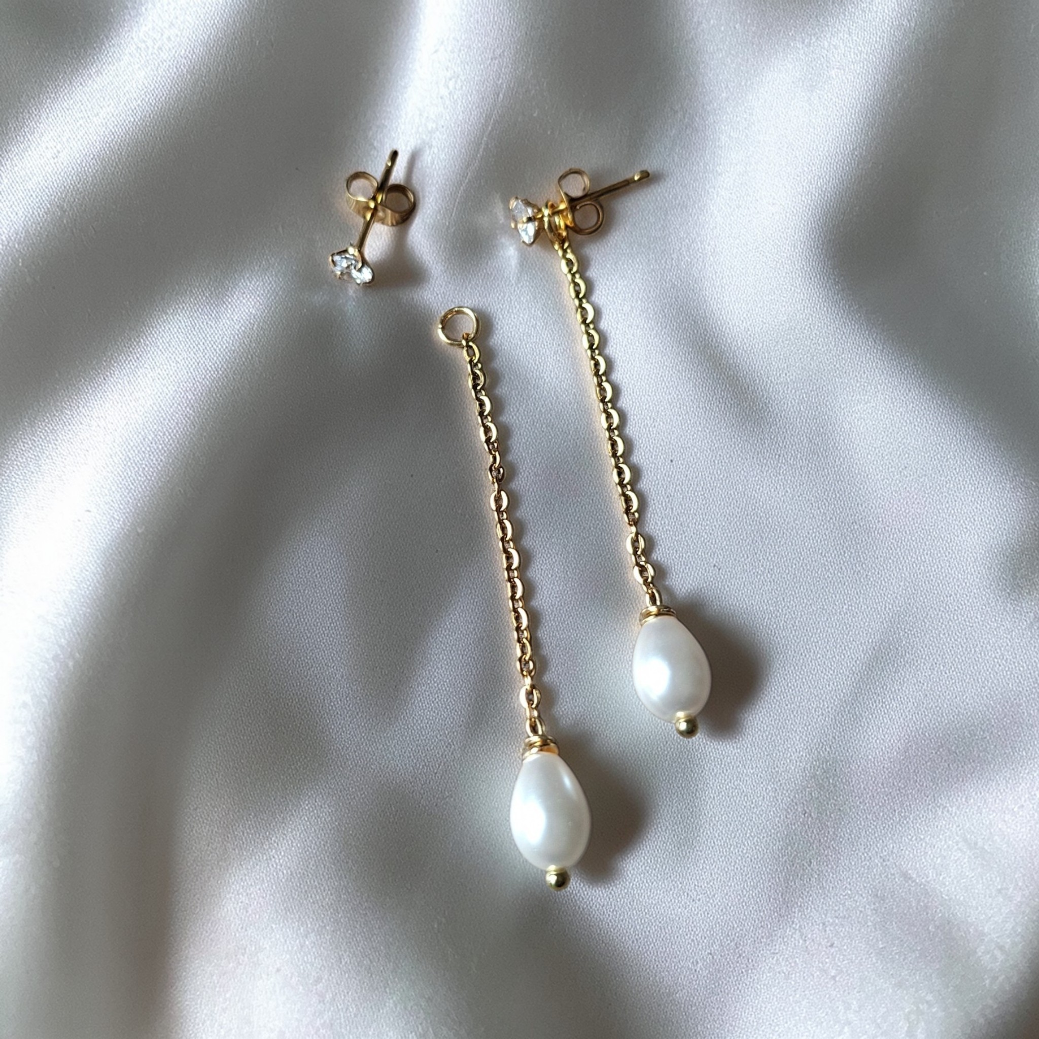 Leur véritable atout réside dans leur modularité : les petits clous d’oreilles ornés de strass sont amovibles et peuvent se porter seuls pour un look discret et lumineux, ou accompagnés des pendantes perlées pour une allure plus sophistiquée le jour du mariage. Ce bijou deux-en-un s’adapte ainsi à tous les moments : cérémonie, vin d’honneur, soirée ou même après le grand jour.