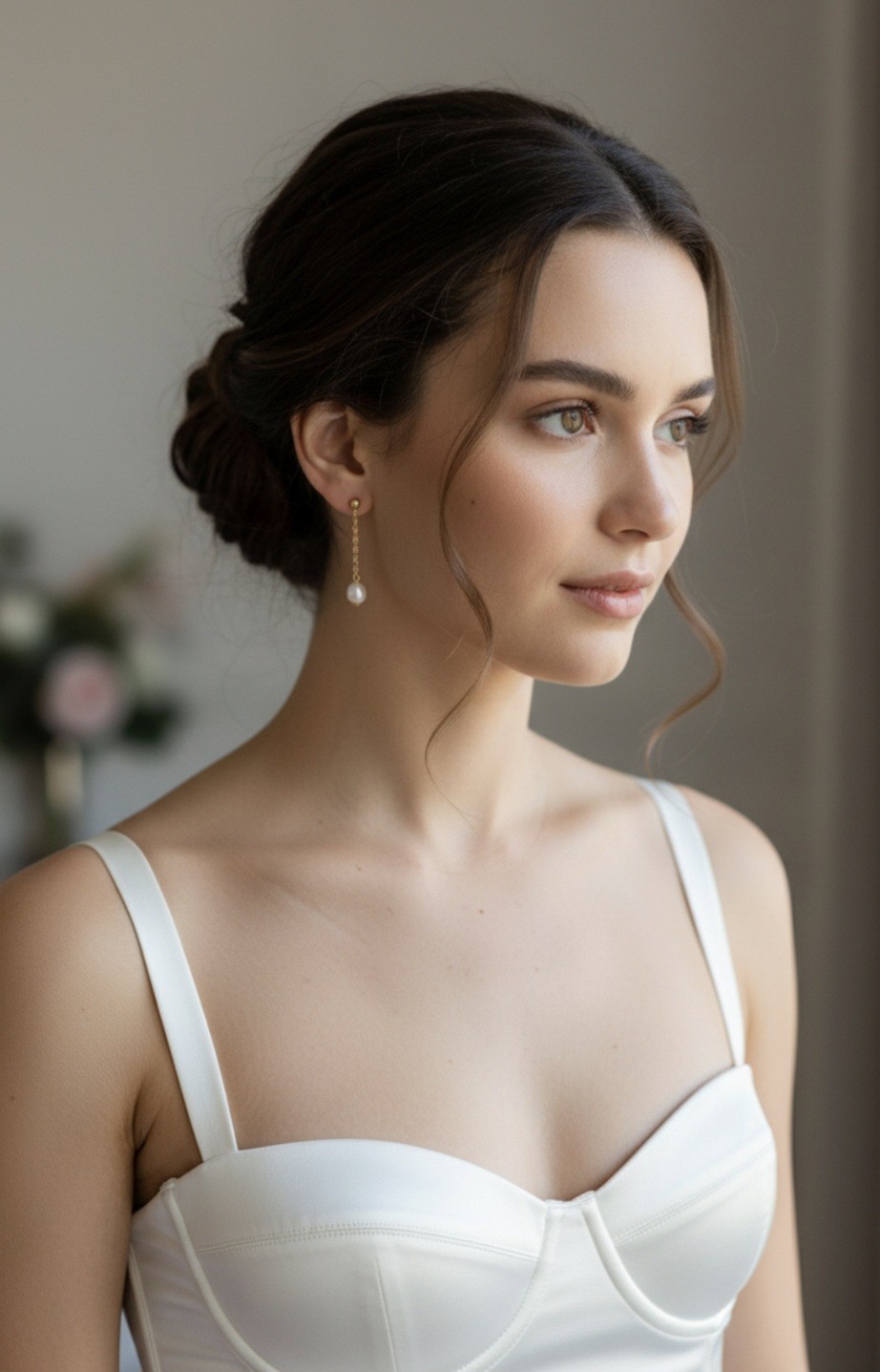 Les boucles d’oreilles pendantes pour mariée, d’une longueur d’environ 50 mm, sont montées sur de petits clous d’oreilles discrets, assurant un maintien confortable tout au long de la journée et de la soirée. Leur ligne fine allonge visuellement le port de tête et apporte une touche lumineuse subtile, idéale pour les photos de mariage et les coiffures relevées.