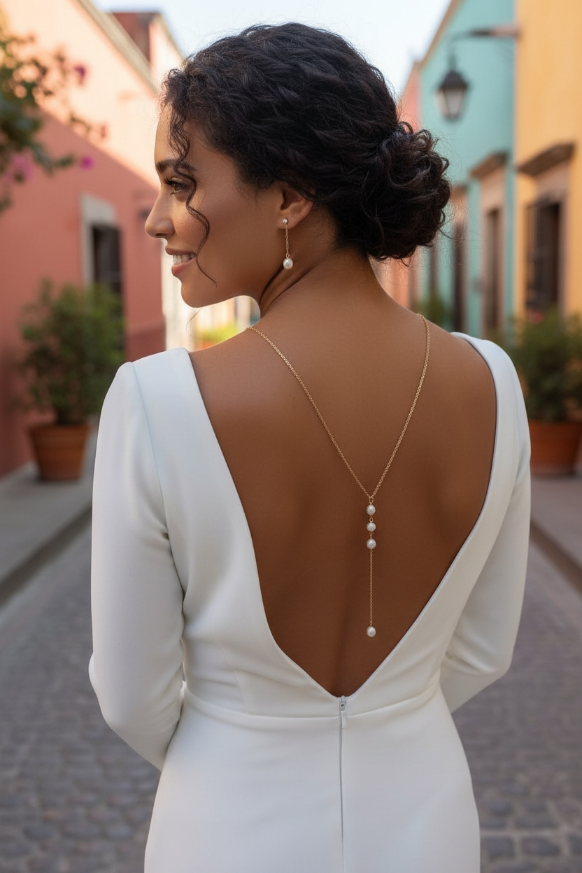 Ce collier de dos pour mariée a été conçu pour sublimer les robes de mariage au dos nu, les décolletés plongeants et les coupes épurées. Grâce à son système d’enfilage par la tête sans fermoir, il offre un confort optimal tout en garantissant une ligne fluide et élégante. Ce bijou de mariage met délicatement en valeur la nuque, le dos et la silhouette, tout en conservant une esthétique légère et raffinée.