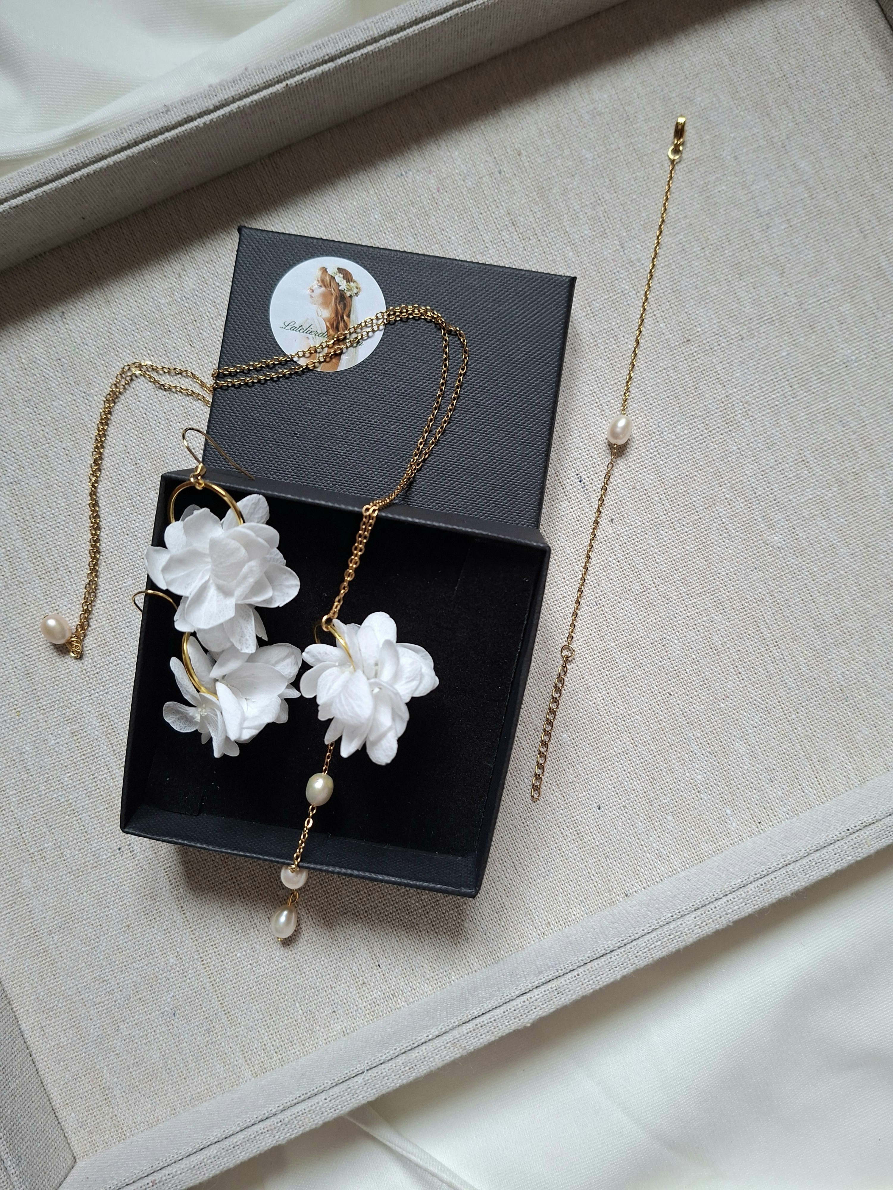 Chaque bijou est réalisé à la main dans l’atelier, garantissant une finition soignée et une qualité durable. Les fleurs naturelles stabilisées ne nécessitent aucun entretien et conservent leur beauté dans le temps. De légères variations peuvent exister, faisant de chaque parure une création unique.