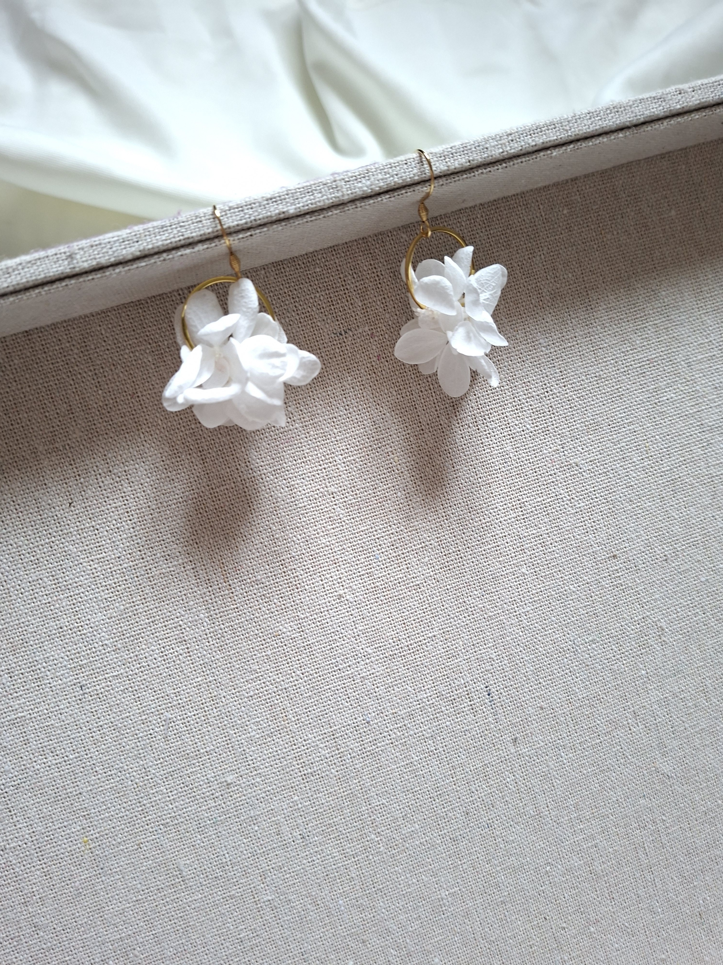 Les créoles de mariée florales, montées sur crochets d’oreilles, sont ornées de fleurs blanches stabilisées assorties au collier. Leur légèreté assure un confort optimal tout au long de la journée et de la soirée.