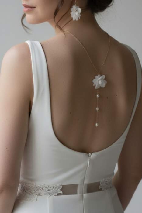 Le collier de dos de mariée est conçu pour sublimer les robes à dos nu, dos plongeant, dos ouvert ou robe de mariée minimaliste. Il s’enfile facilement par la tête et épouse la ligne du dos avec légèreté et élégance.