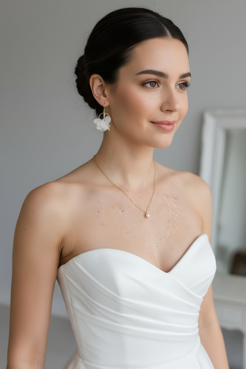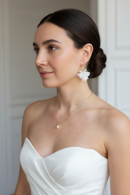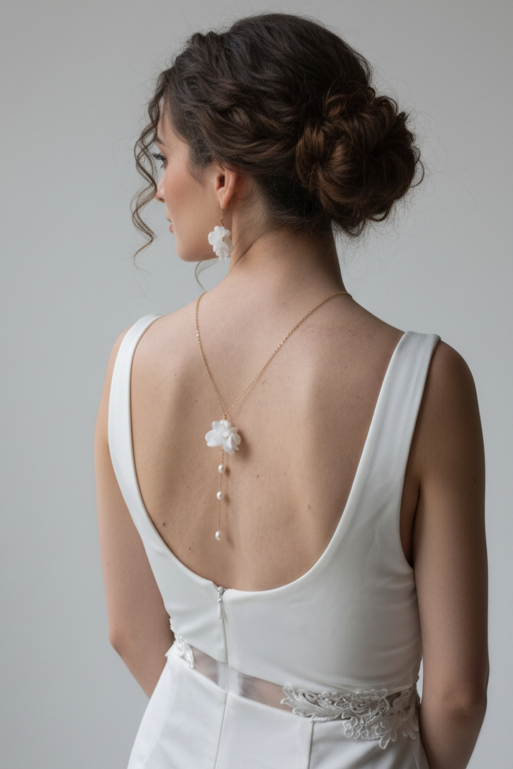 Ce délicat collier de dos de mariée en fleurs blanches stabilisées et perles de culture a été imaginé pour sublimer les robes à dos nu, dos échancré ou décolleté plongeant. Il apporte une touche florale élégante et naturelle, tout en conservant une grande légèreté visuelle.