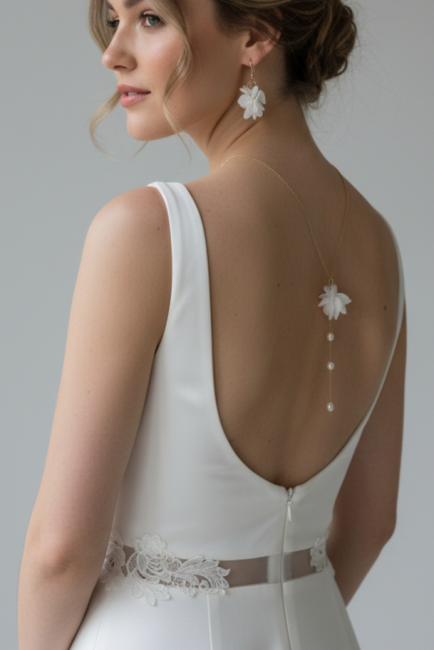 Ce collier de dos en fleurs stabilisées et perles de culture est le choix idéal pour une mariée à la recherche d’un bijou naturel, lumineux et délicat, qui sublime la robe tout en restant élégant et confortable.